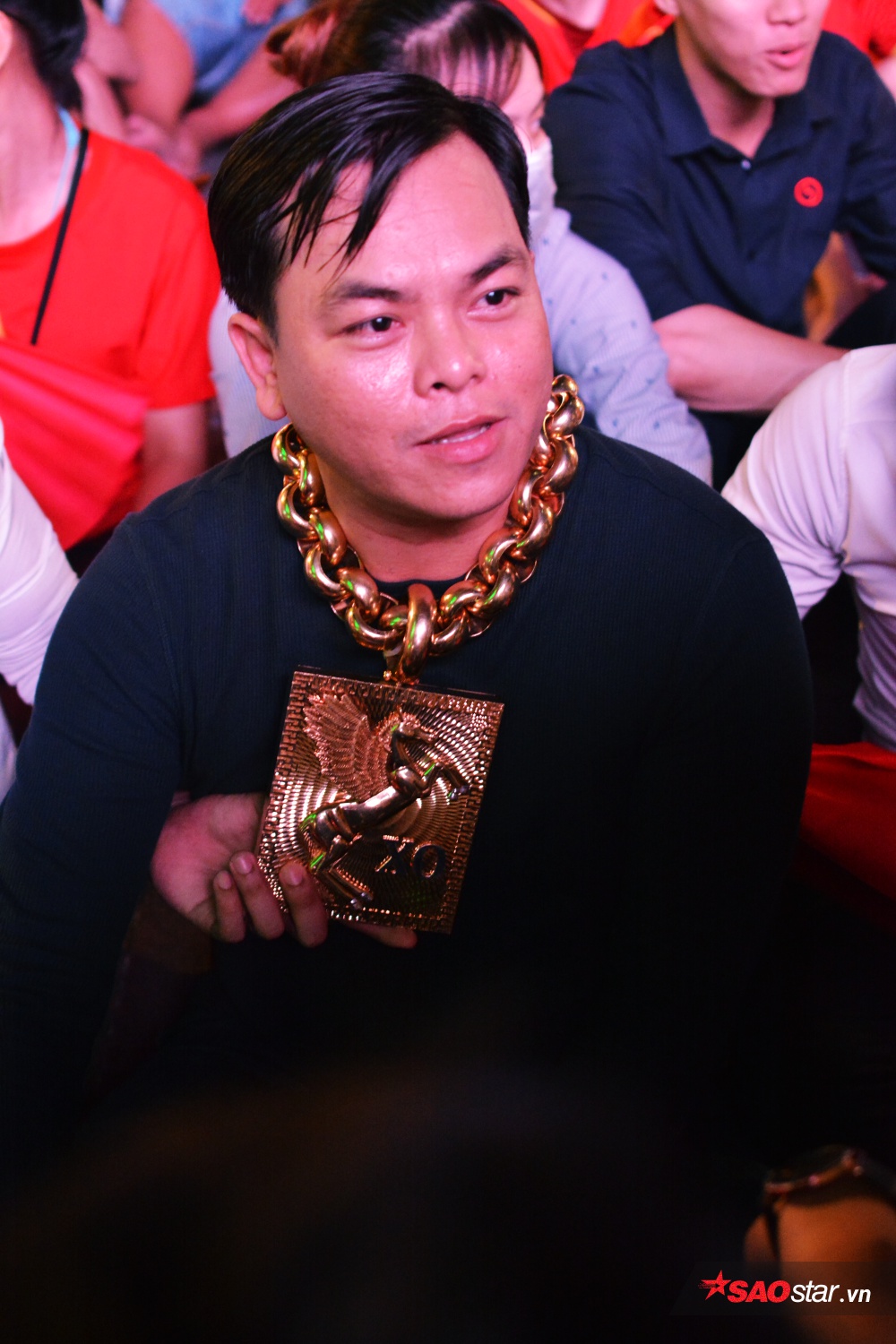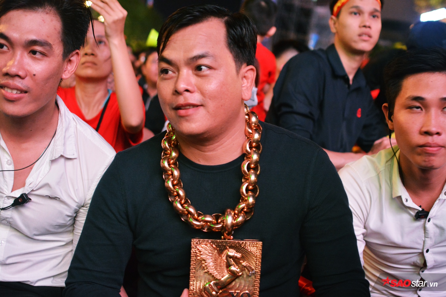 Giữa hàng chục nghìn cổ động viên đến “tiếp lửa” cho đội tuyển Việt Nam tại phố đi bộ Nguyễn Huệ (TP.HCM) có một cổ động viên rất đặc biệt, là cái tên không còn xa lạ với cộng đồng mạng. Đó là anh Trần Ngọc Phúc (36 tuổi, ngụ ở quận 10, TP.HCM) - người từng gây chú ý vì đeo rất nhiều số vàng “khủng” trên người.