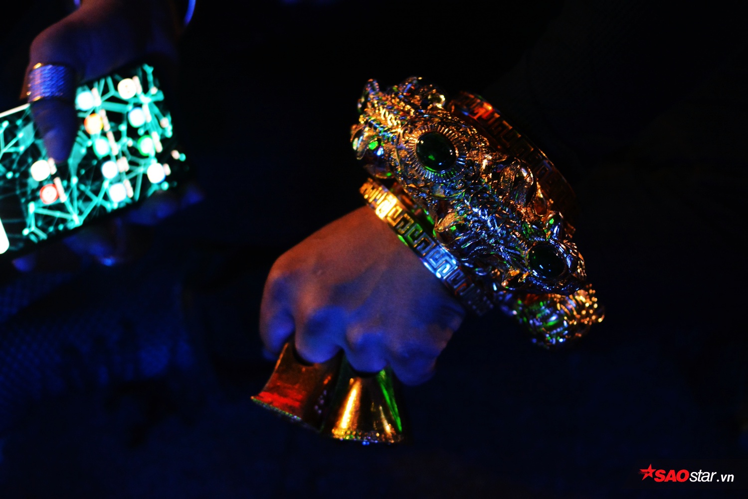 Ngồi dưới đất, vị đại gia còn đeo trên người hơn 13 ký vàng với giá trị hơn 13 tỷ đồng trên người khiến ai nấy đều tò mò, phấn khích. Bộ trang sức bao gồm một dây xích vàng, 2 chiếc nhẫn cỡ bự, một mặt dây chuyền to bản hình vuông, và chiếc vòng tay lớn có đính nhiều hạt ngọc. Số lượng vàng trên không tính bằng cây mà tính bằng cân.