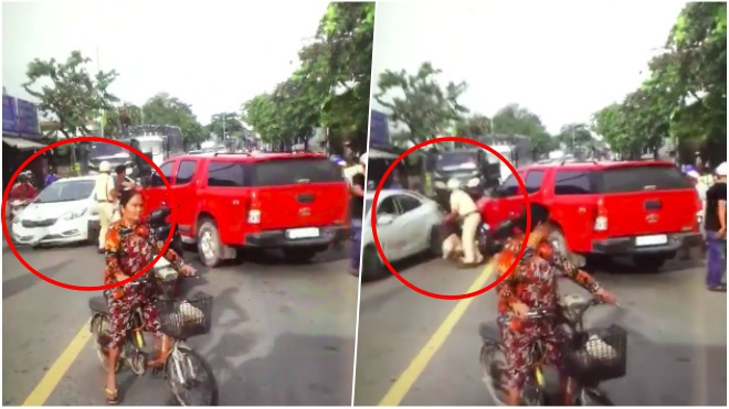 Khi chiến sĩ CSGT cùng hai người dân đang đứng ở phần đầu của xe thì xuất hiện một chiếc ô tô màu trắng cách đó không xa, đã nhấn ga lao tới đâm trúng hai người này. Và sau đó cũng quay đầu xe bỏ chạy theo hướng với chiếc ô tô màu đỏ.