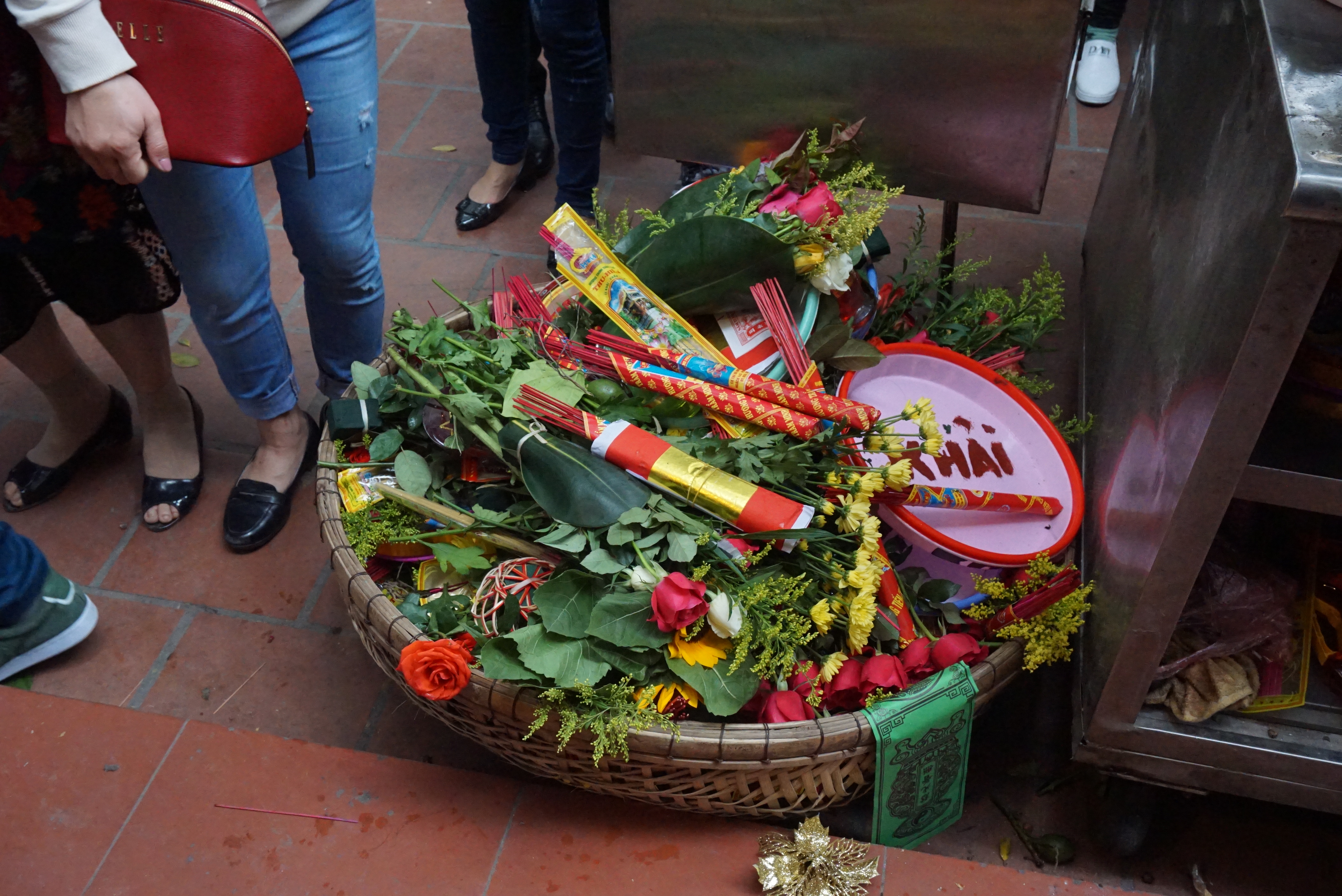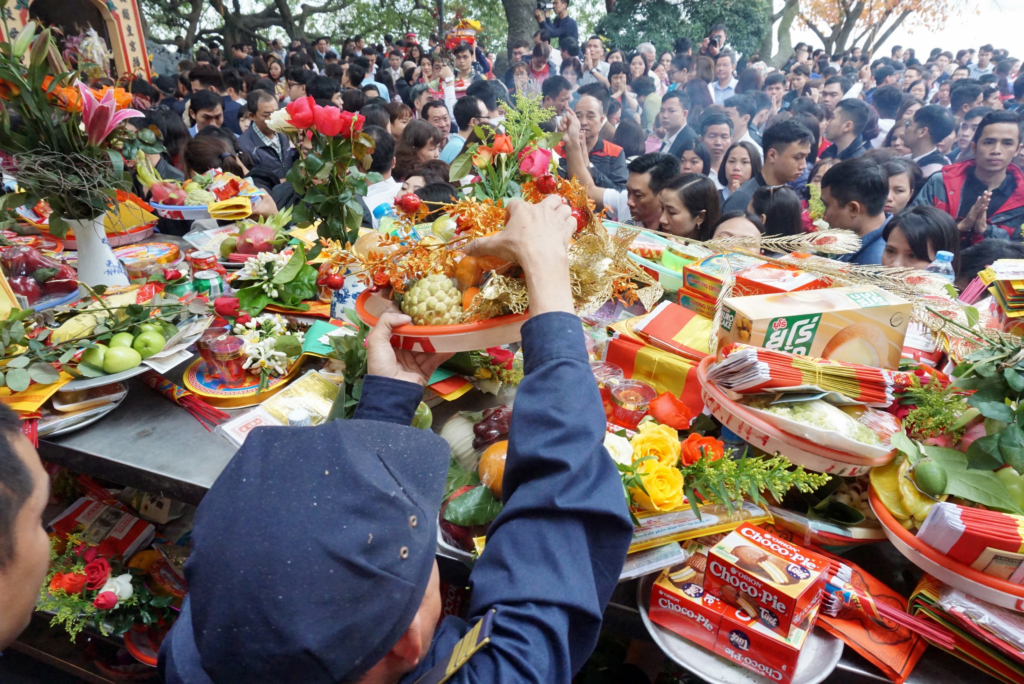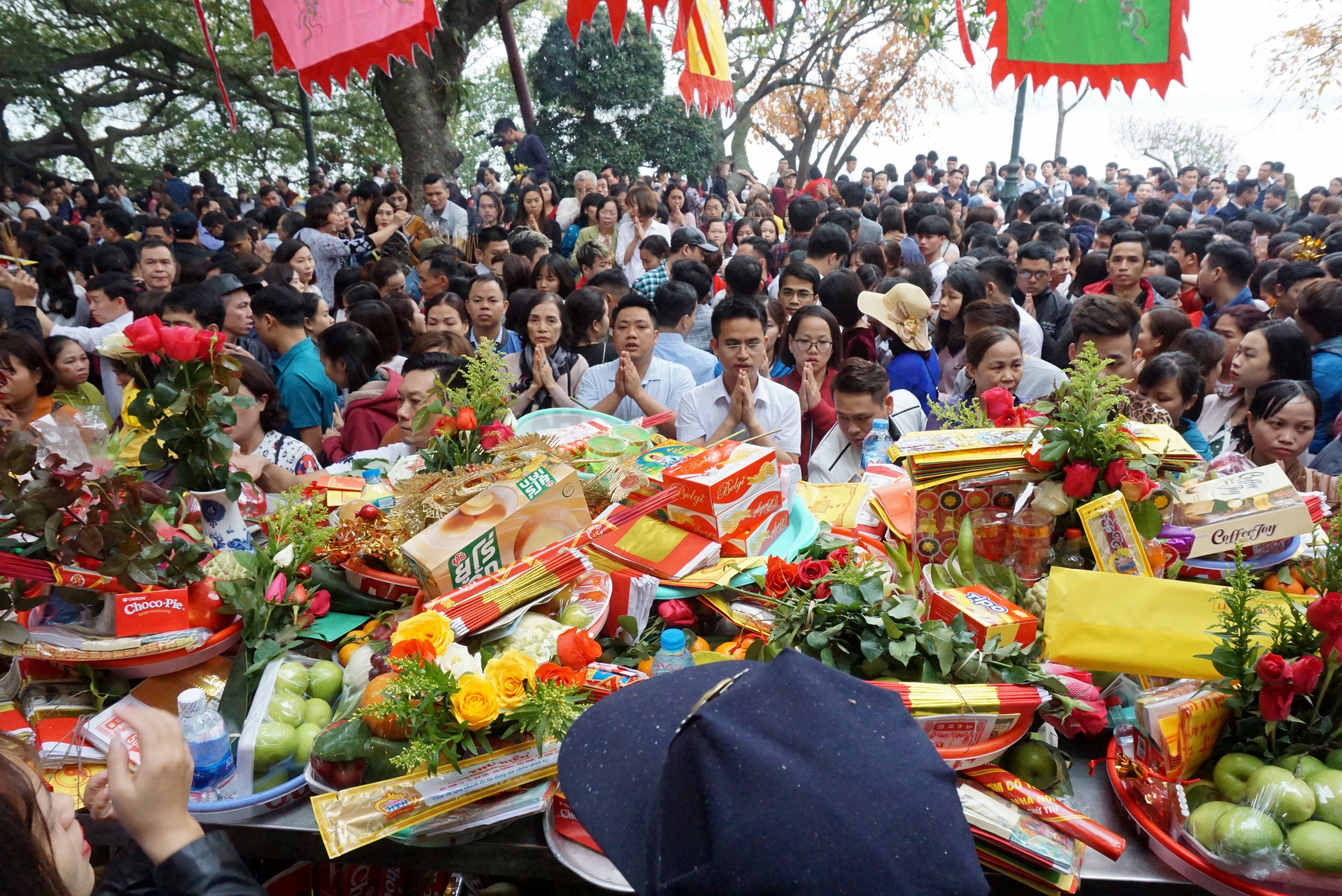 Nhiều dân công sở chuẩn bị tiền vàng, lễ cúng. Do quá đông và chen chúc, nhiều người phải đội lễ lên đầu để tìm cách len lỏi giữa dòng người.
