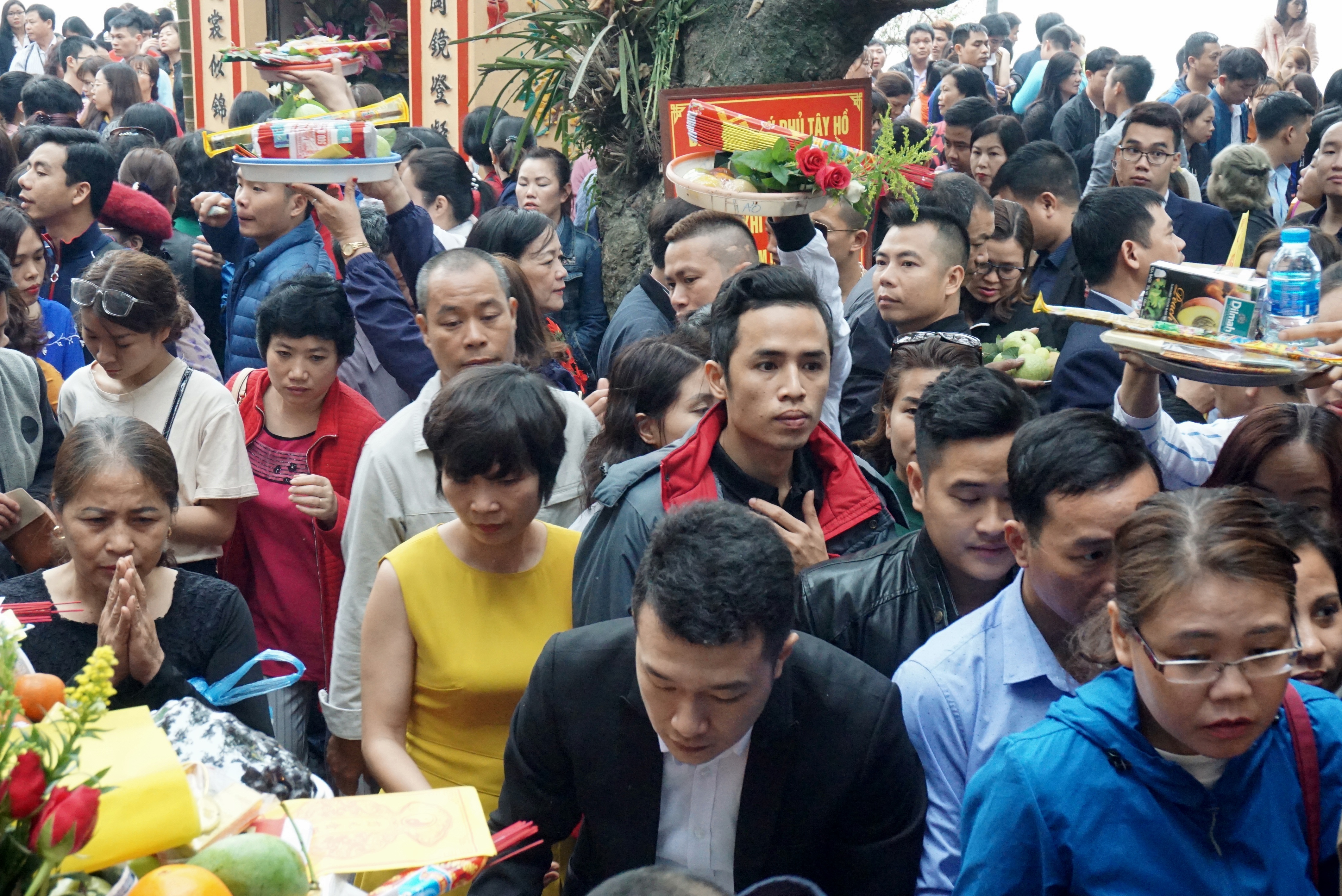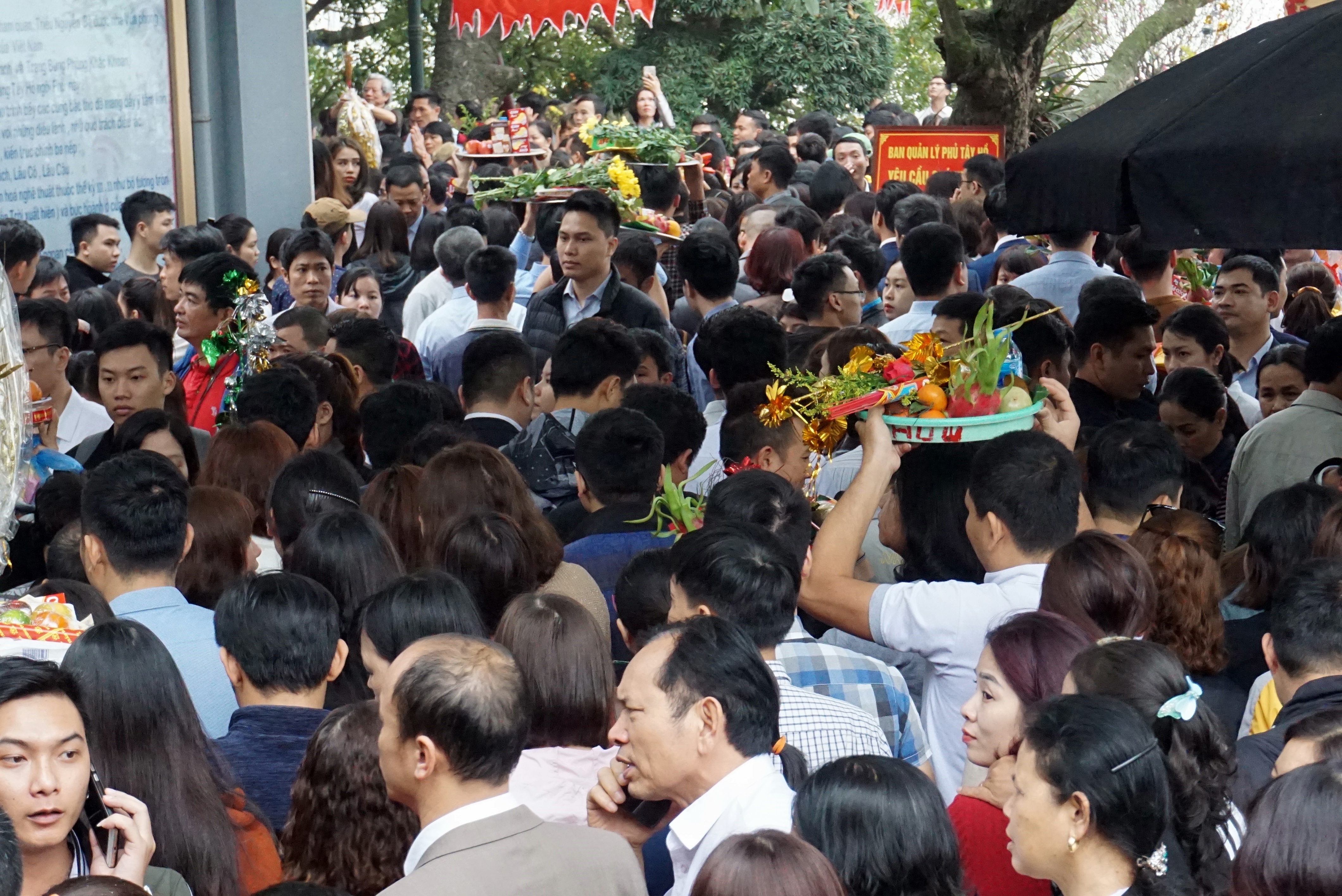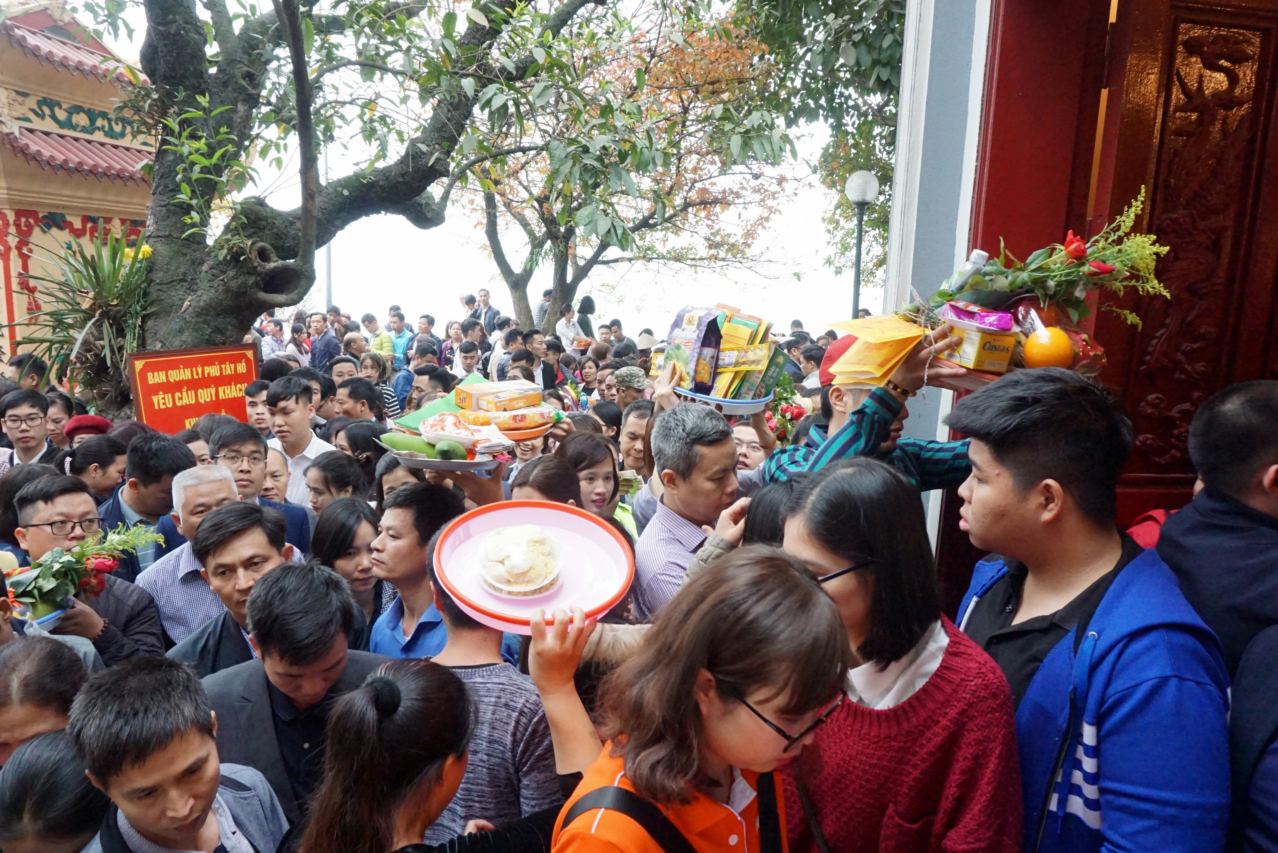 Hàng ngàn người chen nhau từ cổng ngoài vào đến phủ Tây Hồ dâng lễ, khấn vái cầu tài, cầu lộc, cầu bình an cho gia đình đầu năm.