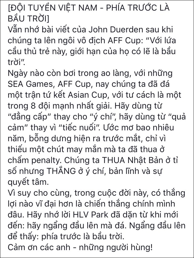 Tối qua, trận đấu Việt Nam gặp Nhật Bản tại tứ kết Asian Cup 2019 đã diễn ra trên sân Al-Maktoum ở Dubai. Dù đã thể hiện rất xuất sắc nhưng may mắn đã không mỉm cười với chúng ta khi Nhật Bản dành chiến thắng chung cuộc với tỉ số 1-0.