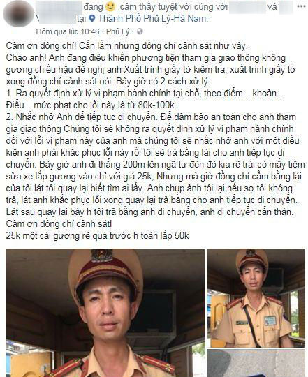 Theo đó, vào ngày 1/5, nam thanh niên có tài khoản T.K điều khiển xe từ Hà Nội về Ninh Bình thì một chiến sĩ CSGT ở Phủ Lý, Hà Nam đã vượt lại cho biết anh này mắc lỗi điều khiển phương tiện tham gia giao thông không gương chiếu hậu. Tuy nhiên, thay vì xử phạt, chiến sĩ CSGT này đã nhắc nhở khắc phục lỗi bằng cách nhắc nam thanh niên đi lắp gương vào xe, rồi quay lại sẽ được trả bằng lái xe di chuyển tiếp.