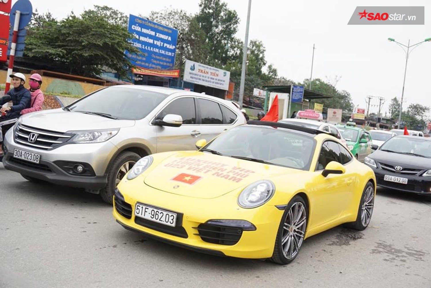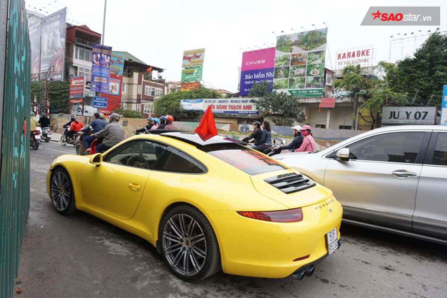 Porsche 911 Carrera GTS 2017 nổi bật giữa dòng người đi đón các cầu thủ.