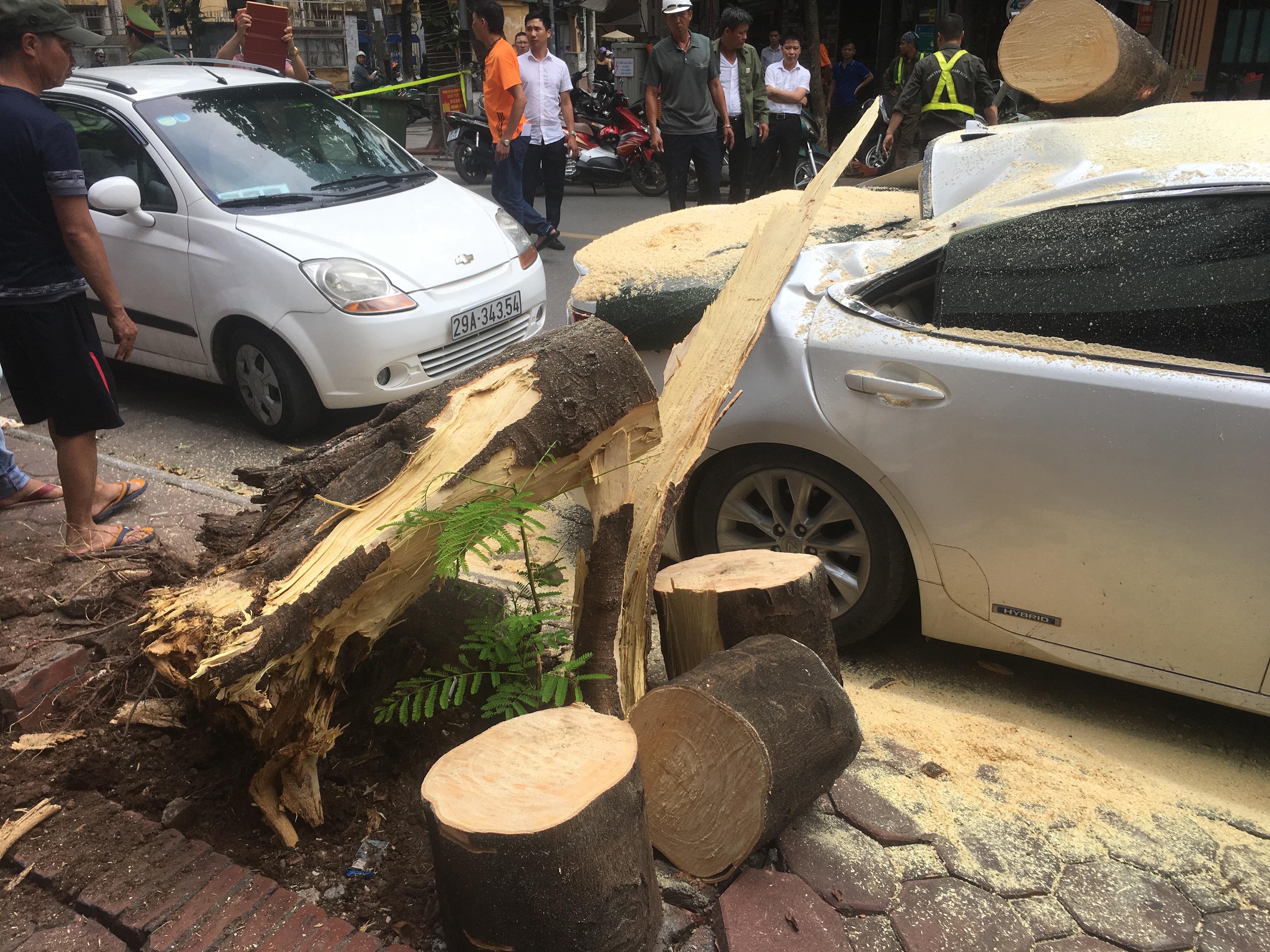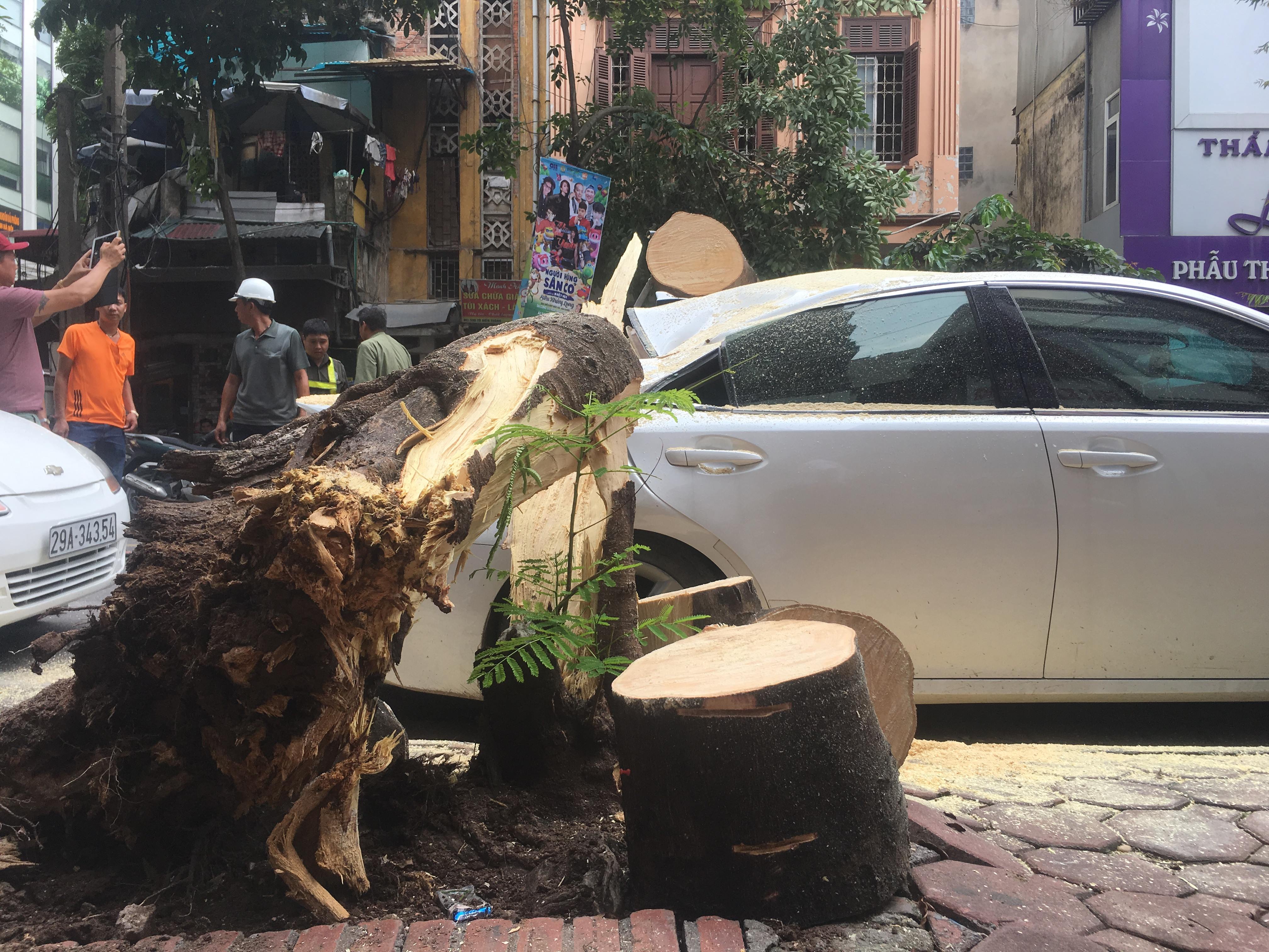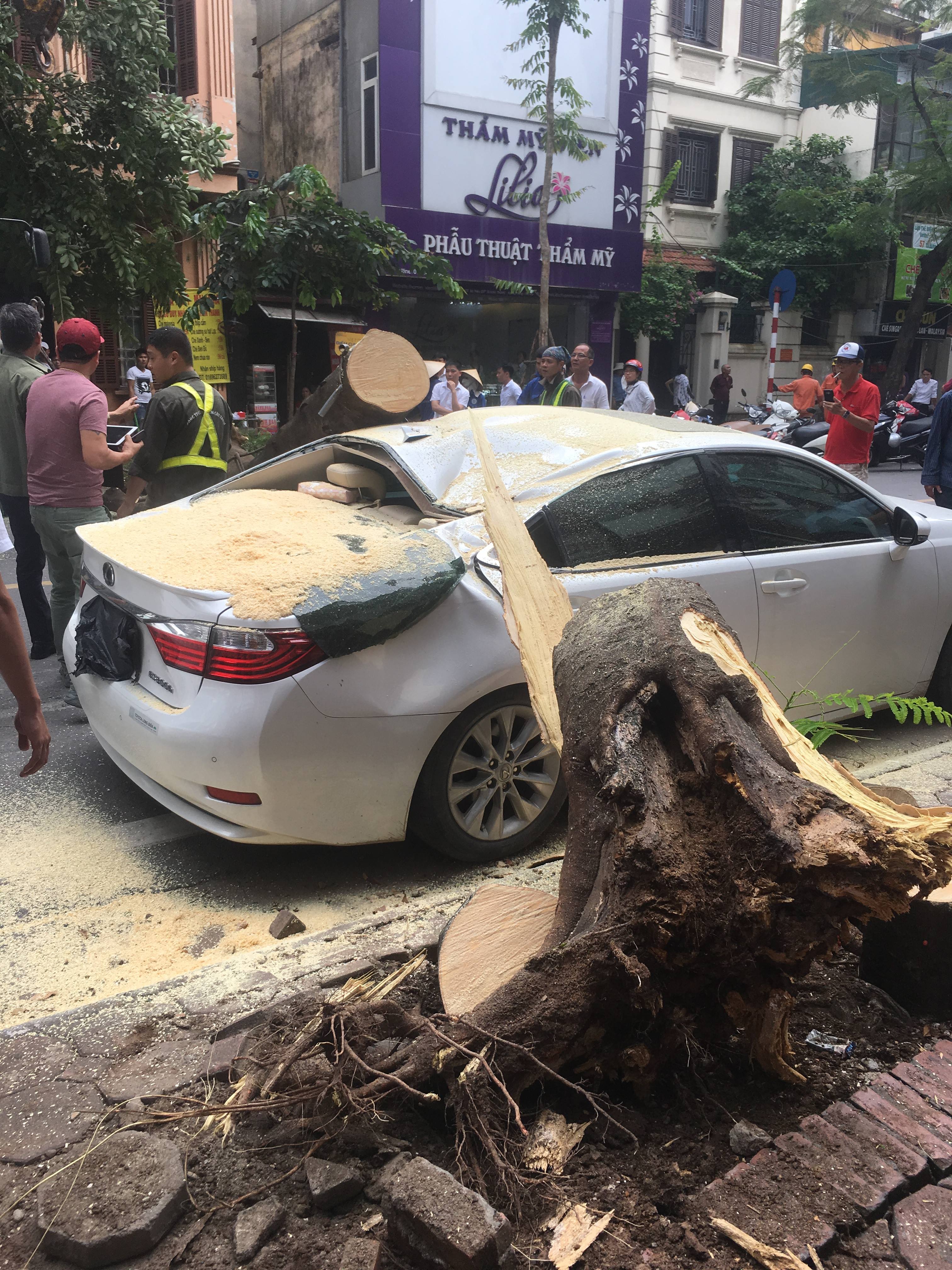 Khoảng 14h ngày 4/6, một cây phượng cổ thụ trên đường Tô Hiến Thành, quận Hai Bà Trưng, Hà Nội bất ngờ đổ xuống đường, đè lên chiếc xe Lexus ES300h màu trắng đang đỗ ven đường.