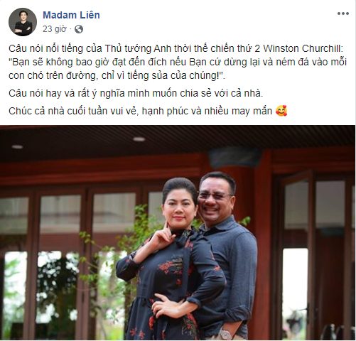 Trong khi những khúc mắc chưa được giải đáp thỏa đáng thì mới đây, trên fanpage được cho là của Shark Liên đăng một dòng trạng thái đầy ẩn ý rằng: “Câu nói nổi tiếng của Thủ tướng Anh thời thế chiến thứ 2 Winston Churchill: “Bạn sẽ không bao giờ đạt đến đích nếu Bạn cứ dừng lại và ném đá vào mỗi con chó trên đường, chỉ vì tiếng sủa của chúng!”. Câu nói hay và rất ý nghĩa mình muốn chia sẻ với cả nhà”.