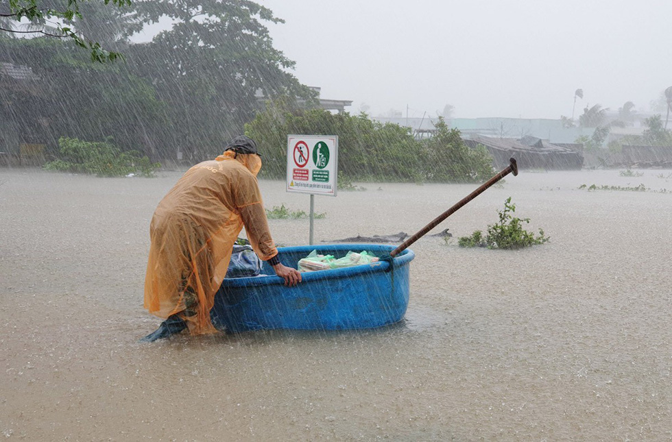 Người dân di chuyển trên đường Trần Phú, thị trấn Dương Đông bằng thuyền thúng chiều 9/8. Ảnh: báo Tuổi Trẻ