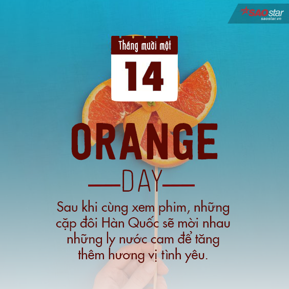 Sau khi cùng xem phim, những cặp đôi Hàn Quốc sẽ mời nhau những ly nước cam để tăng thêm hương vị tình yêu. Trong ngày này, giới trẻ Hàn Quốc thường cùng người yêu đi xem một bộ phim hành động để giải stress, sau đó là một bộ phim tình cảm nhẹ nhàng và mời nhau ly nước cam ngọt ngào thêm hương vị cho tình yêu.