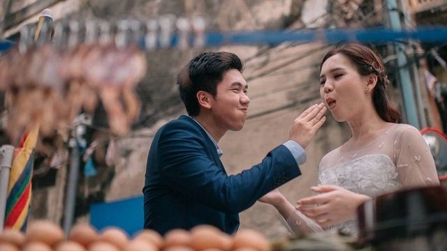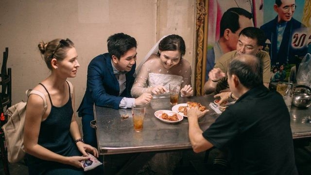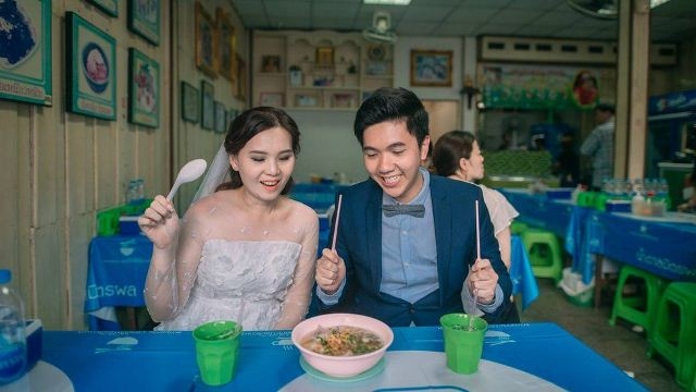 “Khi tôi hỏi về điểm đặc biệt của hai người, cặp đôi nói rằng họ rất thích đi chơi lang thang và ăn uống cùng nhau”, Nitigultanon kể lại. Vậy nên vị nhiếp ảnh gia đã nảy ra ý tưởng đến những quán ăn mà cặp đôi này ưa thích để chụp ảnh cưới.