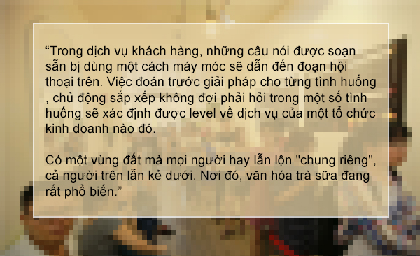 Vị khách chuyên gia kinh tế này cho rằng những gì mà anh được hỏi xuất phát từ sự máy móc, vô cảm của nhân viên, anh cảm thấy không hài lòng về đẳng cấp phục vụ của tiệm trà sữa khi những chi tiết anh cho là nhỏ nhặt như vậy cũng không được chú ý đến.