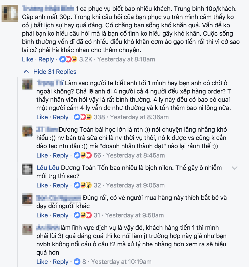 Đã có hơn 3.200 lượt chia sẻ, hàng ngàn comments và hơn 14.000 lượt yêu thích chỉ trong vòng chưa đầy một ngày khi bài viết được đăng tải trên Fanpage kinh tế. Những cuộc chiến nảy lửa giữa cộng đồng mạng, họ chia làm hai phe, phần lớn đứng về phía bạn nhân viên bán hàng, chỉ một số ít tỏ ra ủng hộ câu chuyện của vị chuyên gia kinh tế khi cho rằng dù khách hàng có yêu cầu như thế nào thì công việc của nhân viên là vui vẻ tiếp nhận. Nhưng hầu hết đều đồng tình với cách xử sự của bạn nhân viên trong trường hợp này vì họ đều nhận định trà sữa là loại cửa hàng dịch vụ nhanh, tiện lợi, không thuộc đẳng cấp 5 sao để bắt buộc nhân viên phải có đủ trình độ đọc tâm lý khách hàng.