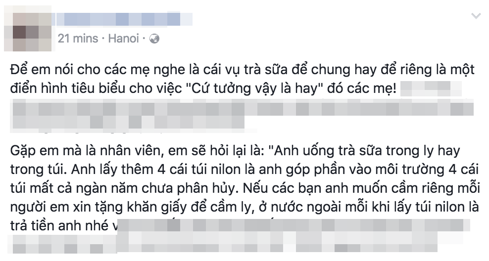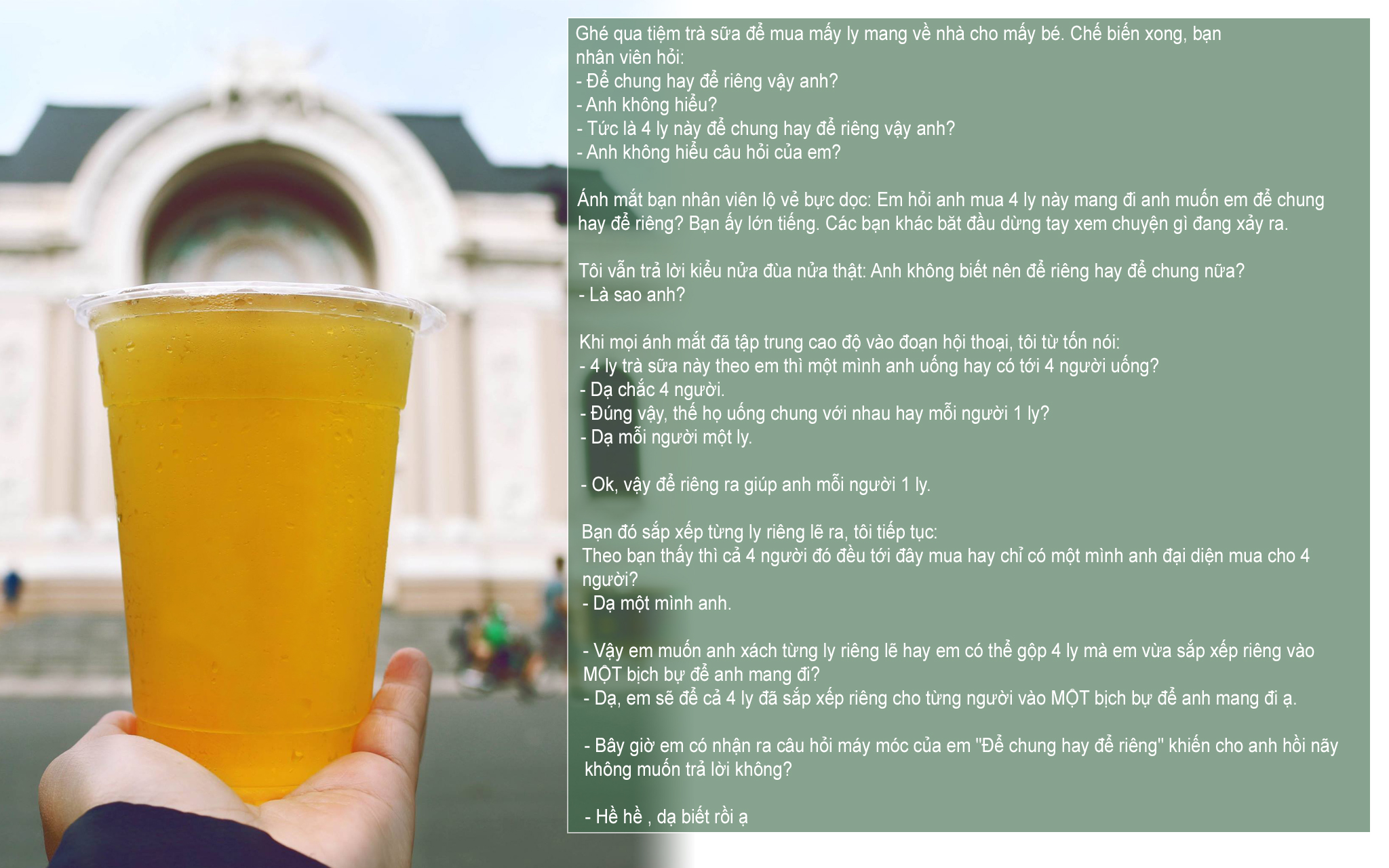 Ngoài ra, như trường hợp của người khách phàn nàn trên, anh đã khiến nhân viên tiệm trà sữa phải dùng đến tận 5 chiếc túi ni lông chỉ cho một đơn hàng, như vậy có phải quá lãng phí và gây ảnh hưởng đến môi trường không? - Nói một cách khác, tuy câu hỏi “Để chung hay để riêng” là khá máy móc, nhưng không thể phủ nhận nó đã giải quyết được nhiều vấn đề.