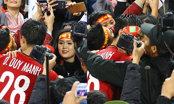 Ngay sau khi nhận cúp vàng cùng huy chương chiến thắng cùng đồng đội, chàng cầu thủ số 28 đã chạy thật nhanh về phía khán đài nơi Quỳnh Anh đang chờ đợi. Trong khoảnh khắc đáng nhớ ấy, Duy Mạnh cũng nhớ về người yêu và mong muốn được sẻ chia niềm hạnh phúc ấy.