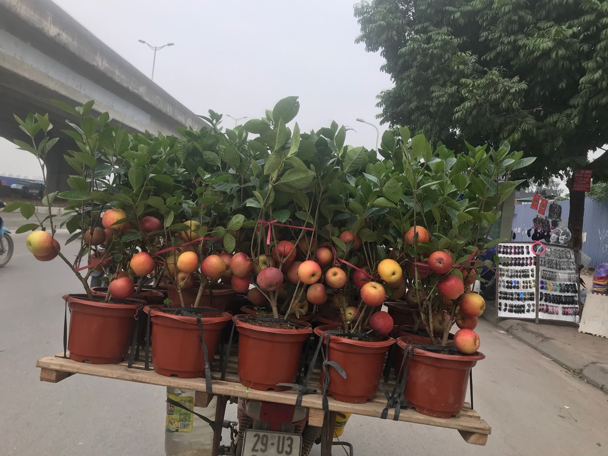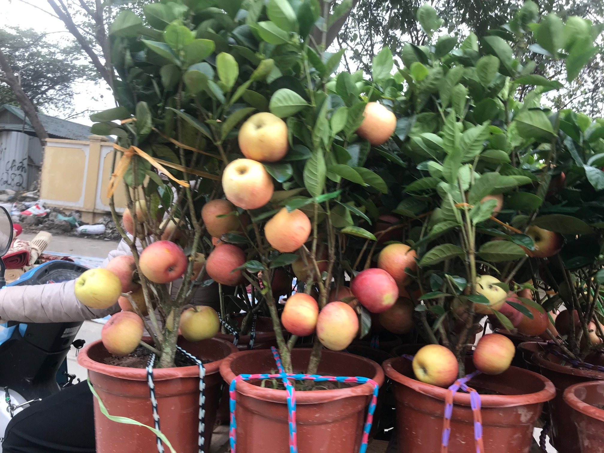 Hình ảnh những cây táo bonsai gắn trên thân cây mít trĩu quả bán dọc đường Hà Nội.