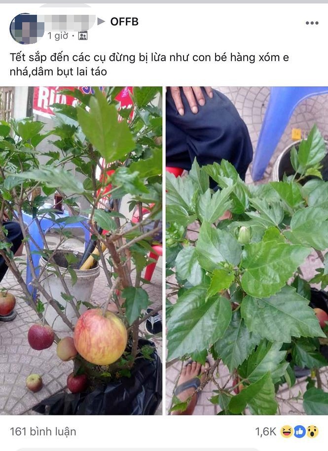 Đồng cảnh ngộ, anh Hưng, (Hoài Đức, Hà Nội) cũng bức xúc chia sẻ hình ảnh cây táo giả mà mình mua lên facebook. “Nhìn cứ tưởng táo thật, ai dè lại là cây dâm bụt. Mất tiền không xót bằng cảm giác bị lừa dối”, anh Hưng viết.
