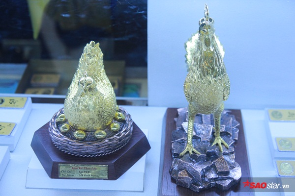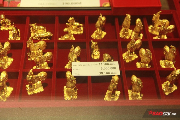 Đôi gà trống mạ vàng ở cửa hàng vàng bạc PNJ có giá 32 triệu (16 triệu 1 sản phẩm). Bên cạnh đó, còn có thỏi vàng tài lộc, bộ 12 con giáp may mắn và các sản phẩm giữ tiền như bao tiền với mức giá khá hợp lý (chỉ từ 1-3 triệu đồng).