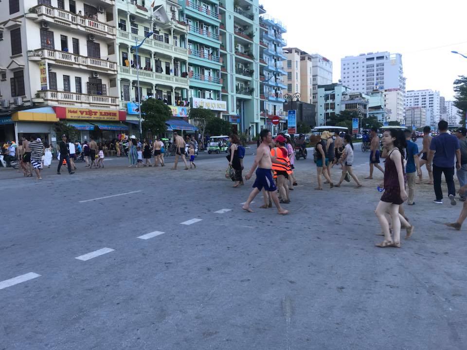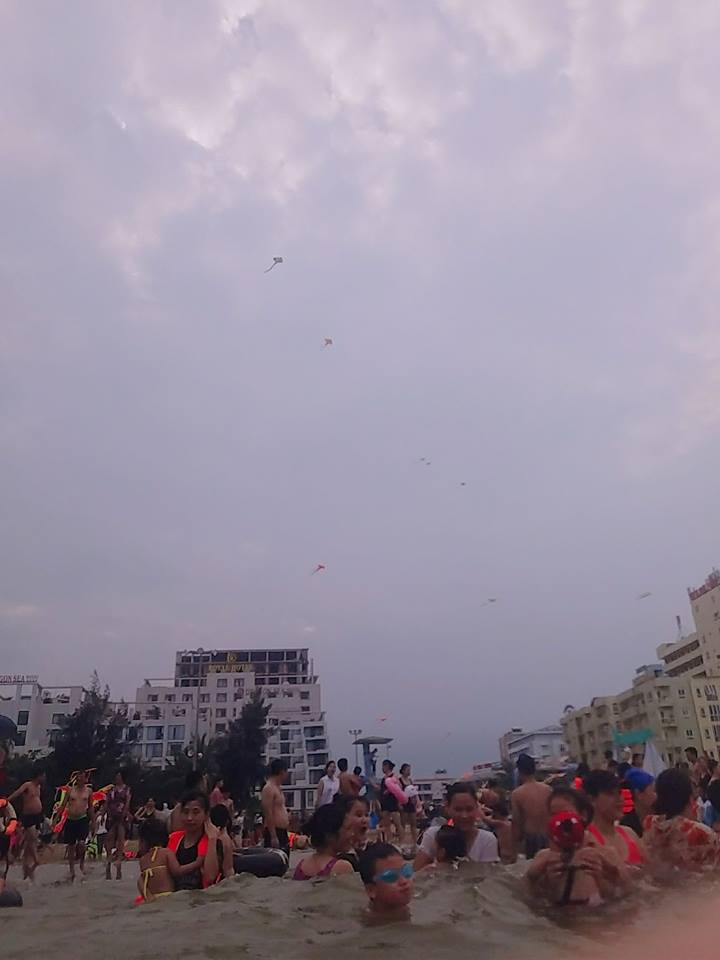 Hạ Thảo viết: ”Đi bao nhiêu biển rồi nhưng lần đầu đến với Sầm Sơn. Bảo trong tuần không đông nhưng mà ra biển lúc hơn 3h chiều đã thấy thế này đây. Muốn chen xuống biển xem sóng đánh mà chả chen được. Ngồi cách bờ cả chục mét mà lúc sau toàn mông với đùi kín mặt. Lời khuyên là ai có ý định đi Sầm Sơn lúc này tốt nhất là ở nhà”