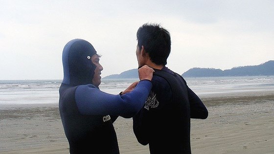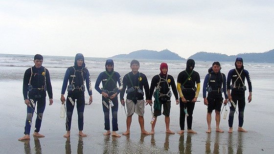 Kiểm tra các dụng cụ trước khi xuống biển.