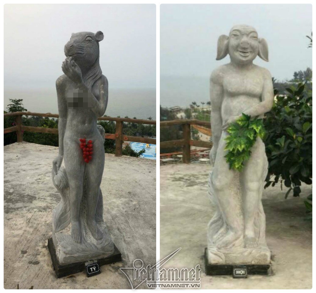 “Cơ quan chuyên môn chưa đưa ra nhận định gì về các bức tượng. Họ yêu cầu chúng tôi tháo bỏ quần mới mặc hôm qua cho các con giáp để chụp ảnh. Khi đoàn công tác chụp ảnh xong, đơn vị đã cho thay 'y phục' cho tượng. Chúng tôi dùng chùm lá, quả nho bằng nhựa để che phần mô phỏng các cơ quan sinh dục của 12 con giáp”, ông Thiềng nói.