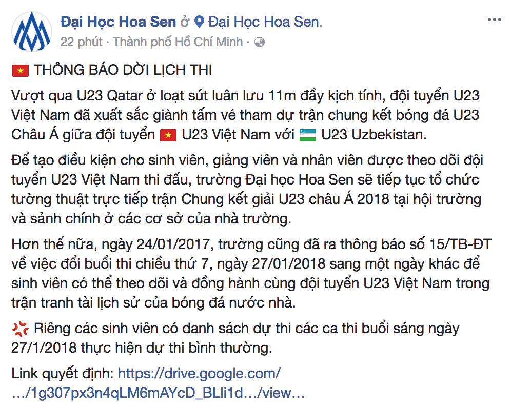Đặc biệt, trường ĐH Hoa Sen (TP. HCM) còn huỷ cả lịch thi buổi chiều ngày hôm đó để các bạn sinh viên có thể tập trung 100% cổ vũ đội tuyển U23 Việt Nam thi đấu.