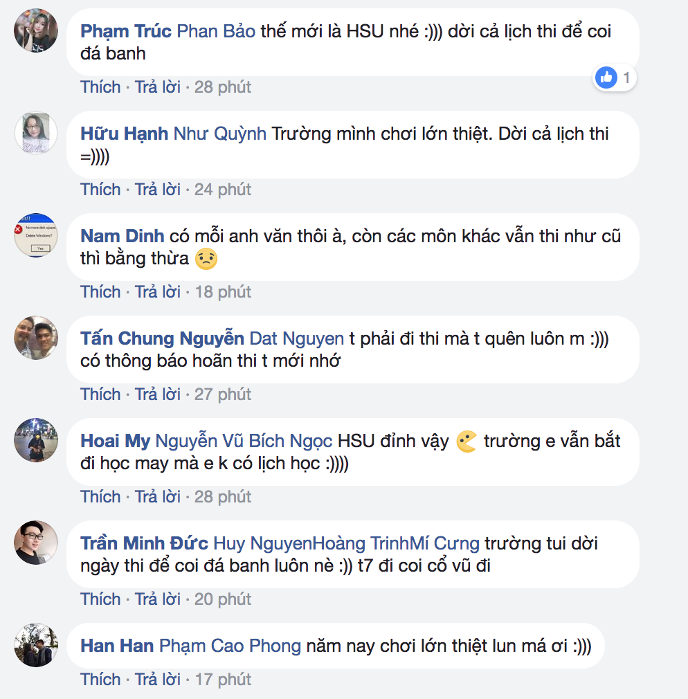 Chắc chắn những bạn sinh viên thi buổi chiều ngày thứ 7 đang là những người vui nhất, bởi có thể tập trung cổ vũ cho đội tuyển U23 và tạm gác lo lắng về kì thi sang 1 bên. Trường ĐH Hoa Sen cũng là trường ĐH tâm lý nhất hệ Mặt trời khi vừa cho sinh viên hoãn thi, vừa tổ chức xem tại hội trường lớn.