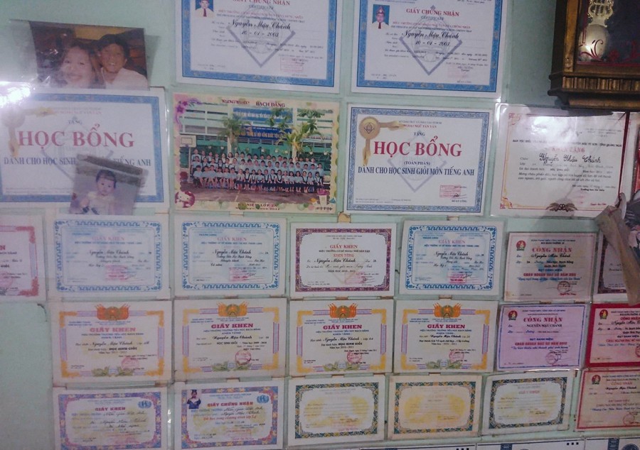 Những giấy khen để biểu dương thành tích học tập của nam sinh Mậu Chánh.