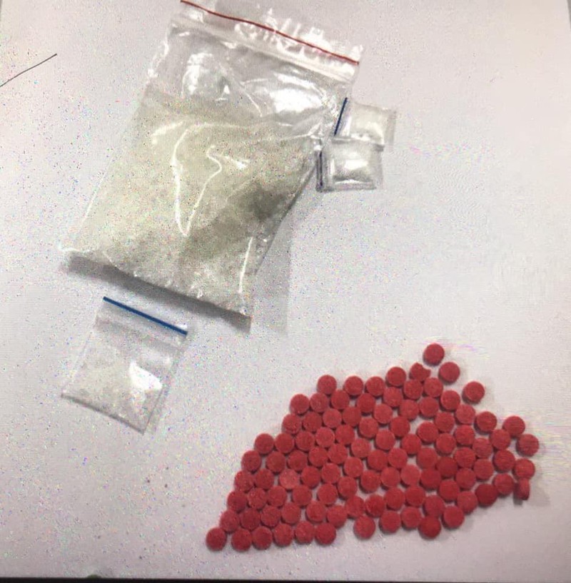 Tiến hành kiểm tra bọc nilon trên chứa một túi đựng đầy ma túy đá, túi còn lại đựng 100 viên hồng phiến, cùng 2 viên nén màu xanh.