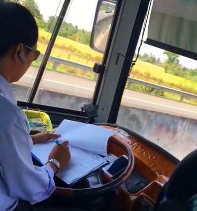 Clip tài xế đọc sách và ghi chép khi xe đang lưu thông. (Nguồn: Facebook Hai lúa)