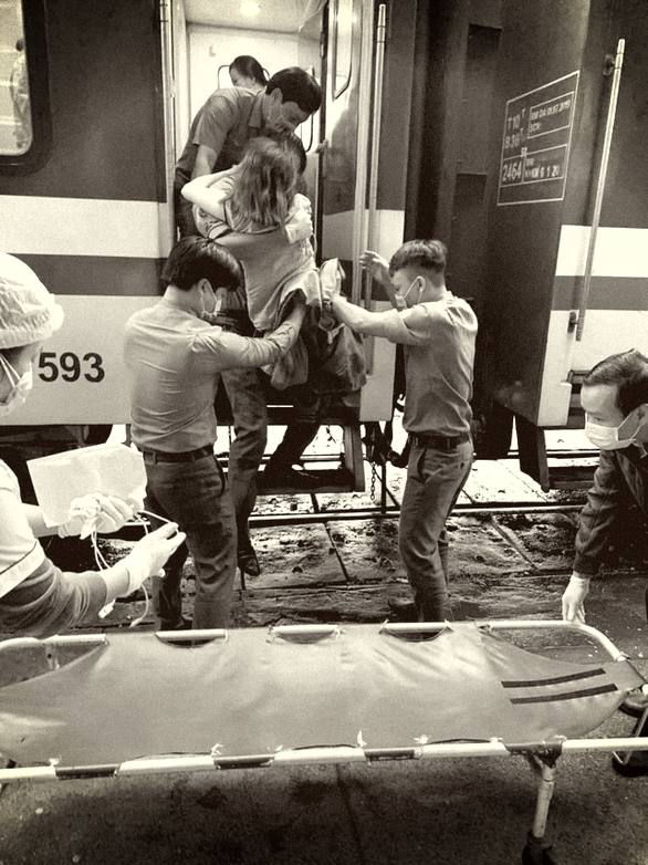 Nhân viên y tế chờ sẵn ở ga Huế để đưa hai mẹ con vào bệnh viện. Ảnh: Báo Tiền Phong