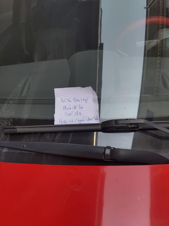 Theo đó, chủ của chiếc xe màu đỏ nhận được lời nhắn như sau: “Đỗ xe đầu ngõ phải để lại số điện thoại. Hãy là người văn minh” .