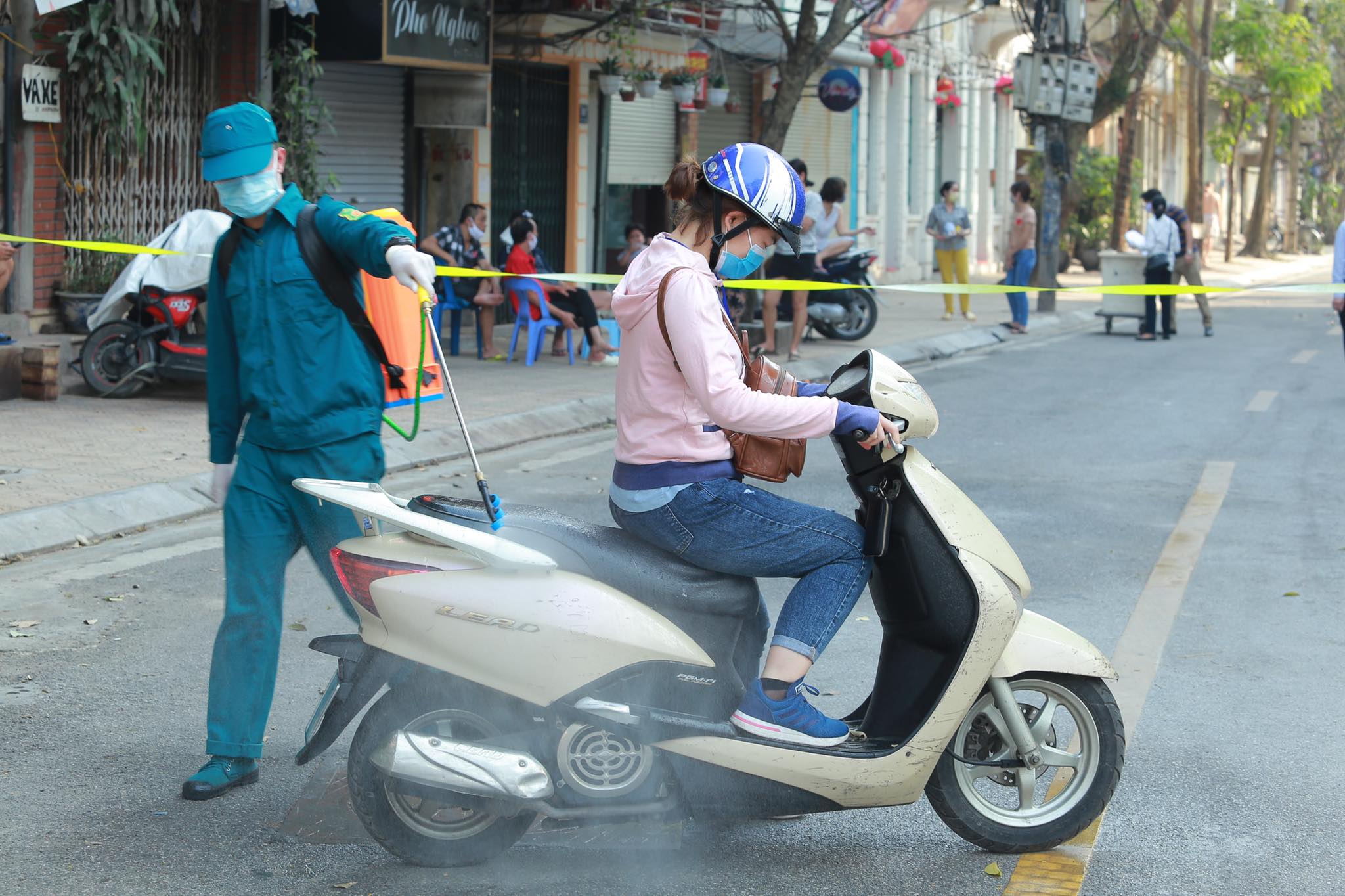 Lực lượng chức năng phun thuốc sát trùng người ra vào phố Trúc Bạch.