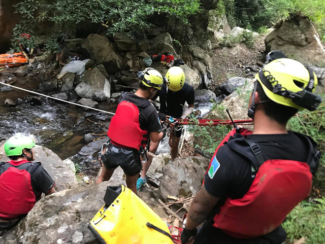 Thi thể phượt thủ Thi An Kiện được đưa lên qua 3 tầng thác dữ.