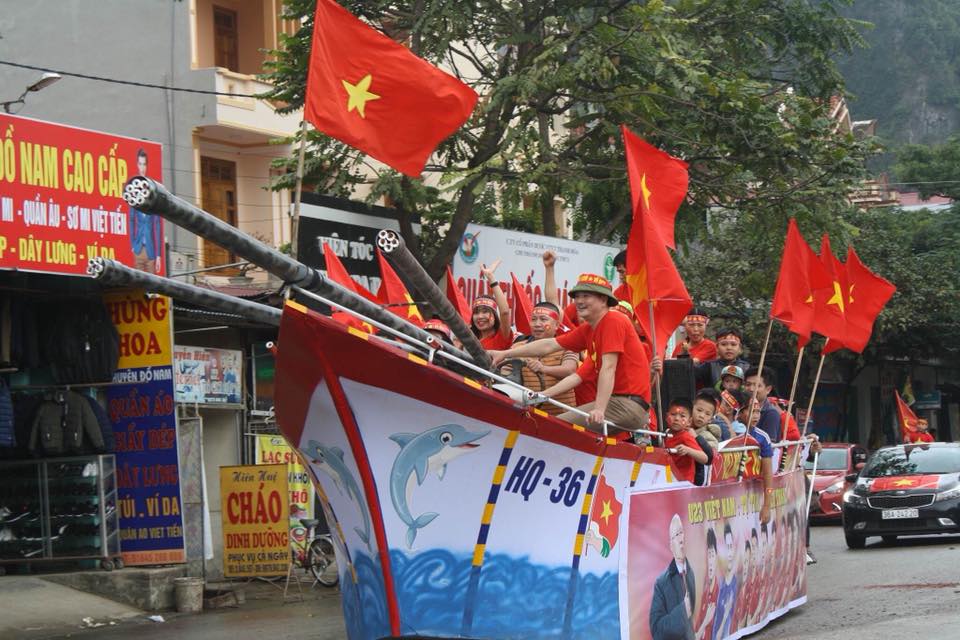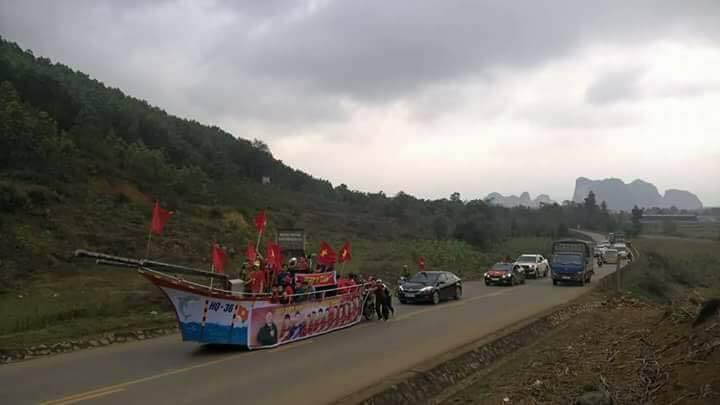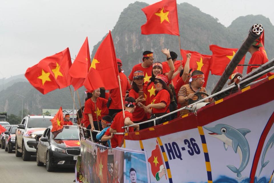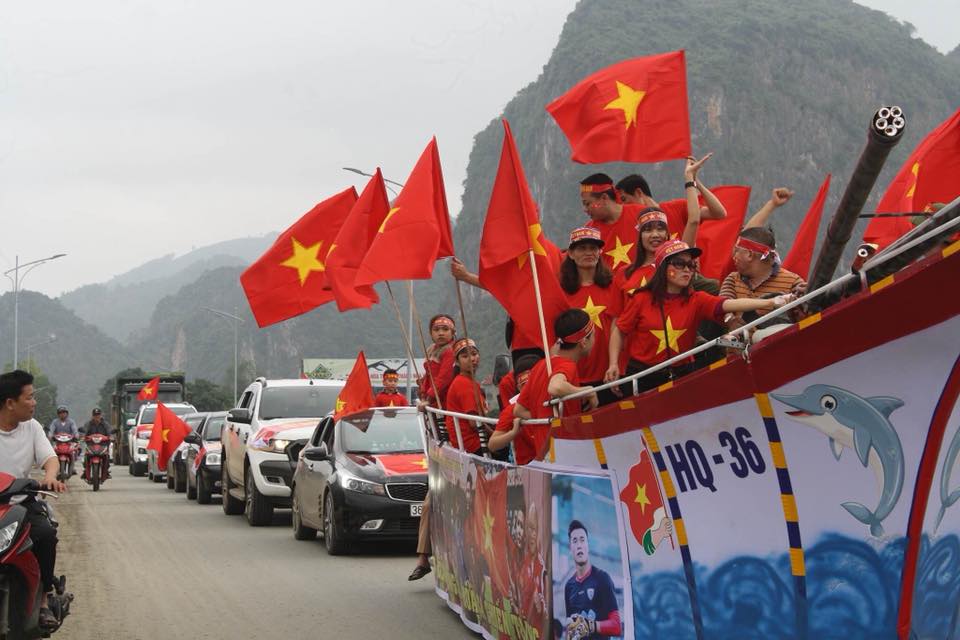 Đoàn xe khoảng 50 người dân xuất phát từ thôn Dương Huệ, huyện Cẩm Thuỷ sang huyện Ngọc Lặc, Thanh Hoá, nơi gia đình thủ môn Bùi Tiến Dũng sinh sống.