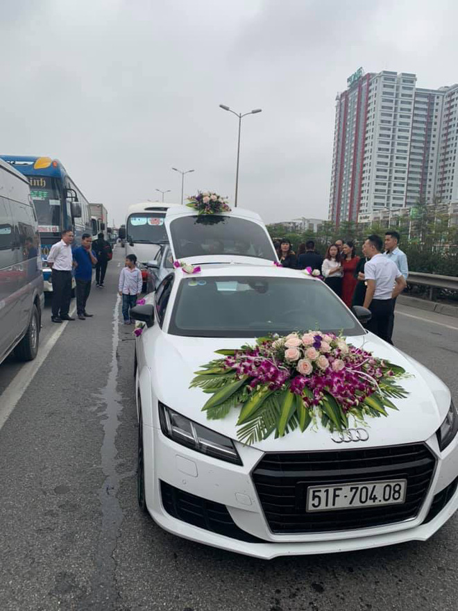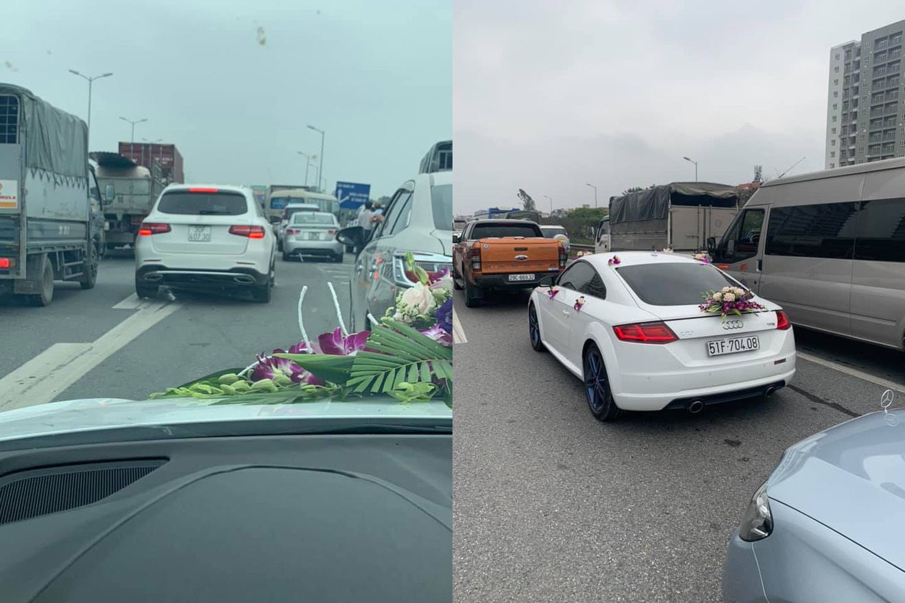 Xe rước dâu cũng vì thế mà “chôn chân” trên đường cao tốc. Ảnh: Facebook