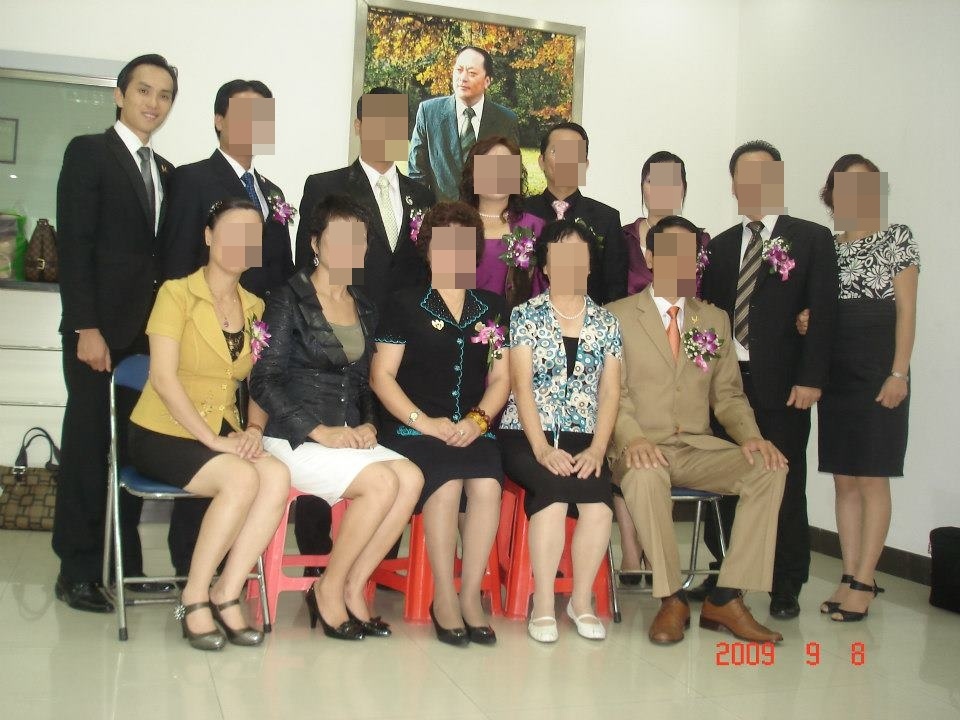 Doanh nhân Nguyễn Mạnh Hà chụp cùng các cộng sự cao cấp tại công ty đa cấp Thiên Sư, trụ sở tại Việt Nam năm 2009, phía sau là ảnh của chủ tịch Tập đoàn Thiên Sư - ông Lý Kim Nguyên (tỉ phú người Trung Quốc). Ảnh: Vietnammoi.
