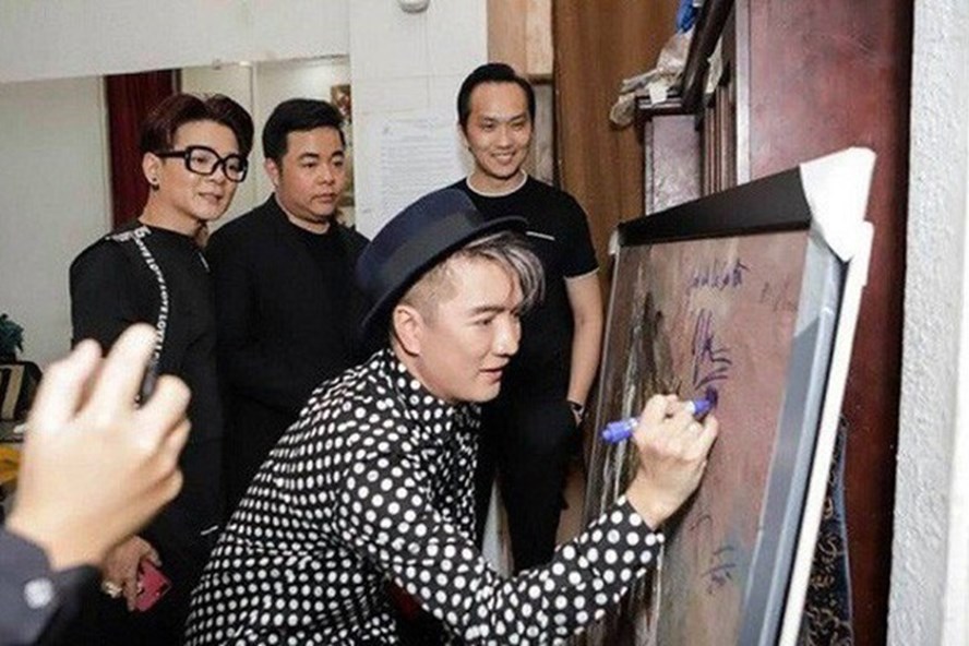 Ca sĩ Đàm Vĩnh Hưng, Vũ Hà, Lệ Quyên kí vào bức tranh của họa sĩ Hứa Thanh Bình đang khiến dư luận dậy sóng. Ảnh: báo Lao động.