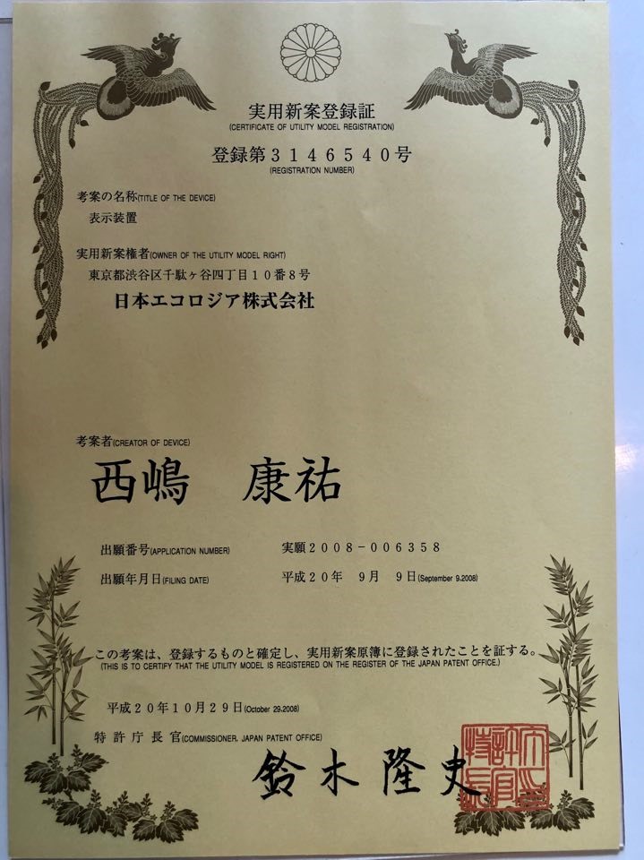 Chứng nhận thương hiệu Japan Ecologia do ông Nishijima làm chủ.
