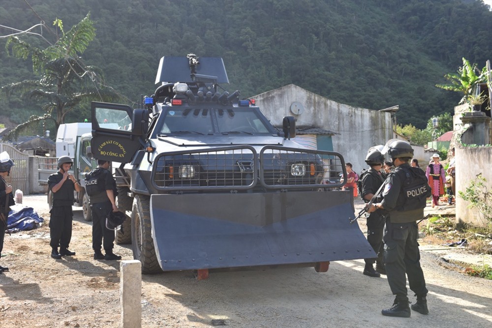 Xe bọc thép và xe xử lý bom mìn được điều đến, cán bộ mặc áo rà phá bom, mìn để tiếp cận hiện trường. Vũ khí thu giữ tại nhà Tuân. Ảnh: Huy Hà