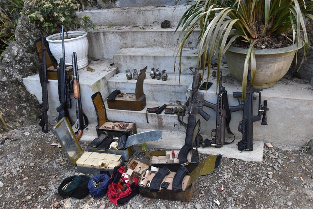 Khám nghiệm hiện trường, ngoài một kho vũ khí gồm 49 khẩu súng quân dụng các loại, 19 quả lựu đạn, 29 ống giảm thanh và ống ngắm, 31 hộp tiếp đạn các loại bên trong chứa đầy đạn, hơn gần 7.000 viên đạn các loại công an còn thu giữ 11 can xăng, 37 bình gas và nhiều vật chứng khác có liên quan.