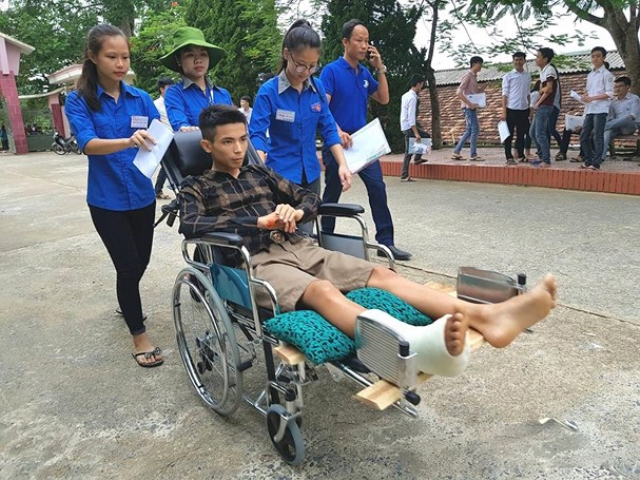 Thí sinh bị gãy chân được các tình nguyện đưa đến.