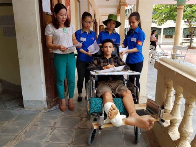 Khoảng cách từ nhà Mạnh (xã Cát Văn, huyện Thanh Chương) đến điểm thi trường THPT Thanh Chương 3 gần 10km. Các tình nguyện viên đã dùng xe máy, chở Mạnh từ nhà đến trường, sau đó dùng xe lăn đưa Mạnh vào phòng thi.
