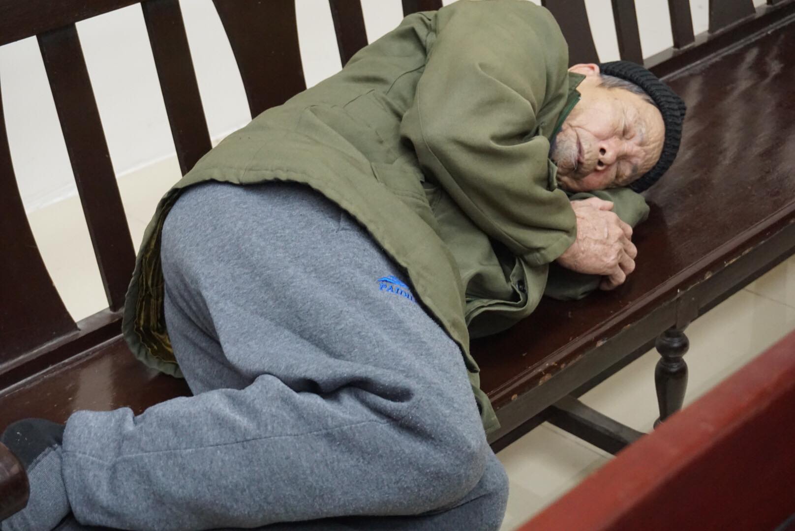 Bị cáo Vĩnh nằm mệt mỏi tại tòa.