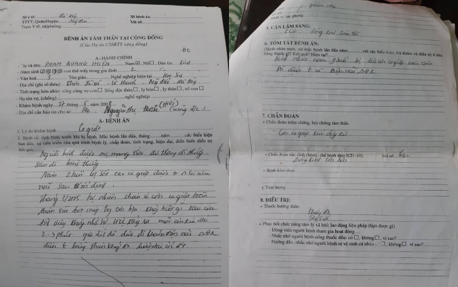 Theo bệnh án tâm thần cộng đồng, chẩn đoán triệu chứng, hội chứng tâm thần là cơn co giật kiểu động kinh. Chẩn đoán xác định bệnh theo mã số 640 là động kinh cơn lớn. Hiện tại, Thiện vẫn nhận chế độ của người bệnh tật.