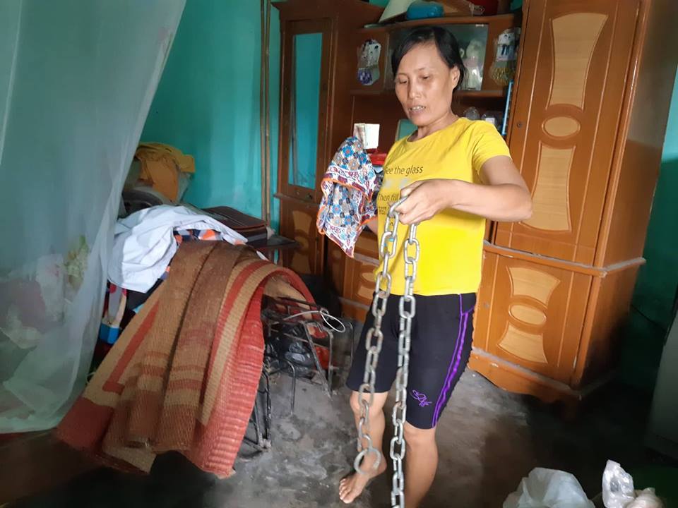 Bà Hiến cầm cái xích từng nhiều lần dùng xích chân con lại.