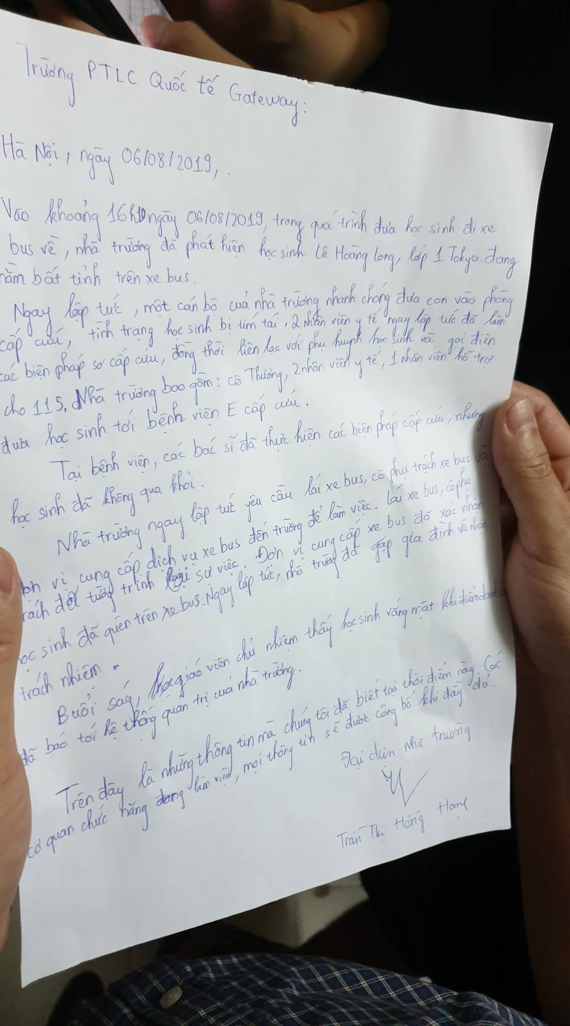 Tối 6/8, bà Trần Thị Hồng Hạnh, Chủ tịch hội đồng quản trị Trường phổ thông chất lượng cao quốc tế Gateway, quận Cầu Giấy, Hà Nội cho biết, vào khoảng 16h10 cùng ngày, trong quá trình nhà trường đưa học sinh bằng xe buýt về đã phát hiện học sinh Lê Hoàng L. (lớp 1 Tokyo) đang nằm bất tỉnh trên xe.