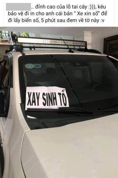 Hóa ra vị tài xế nhờ bảo vệ đi in hộ mình tấm biển có chữ “xe xin số” để đi lấy biển số. Ai dè bảo vệ lại là người có “lỗ tai cây”, từ “xe xin số” nghe nhầm thành “xay sinh tố”, rồi sau 5 phút mang về tấm biển hài hước khiến chính tài xế cũng không nhịn nổi cười.