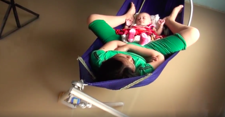 Một ngời phụ nữ ôm con nằm trên võng, phía dưới sàn nhà ngập nước.