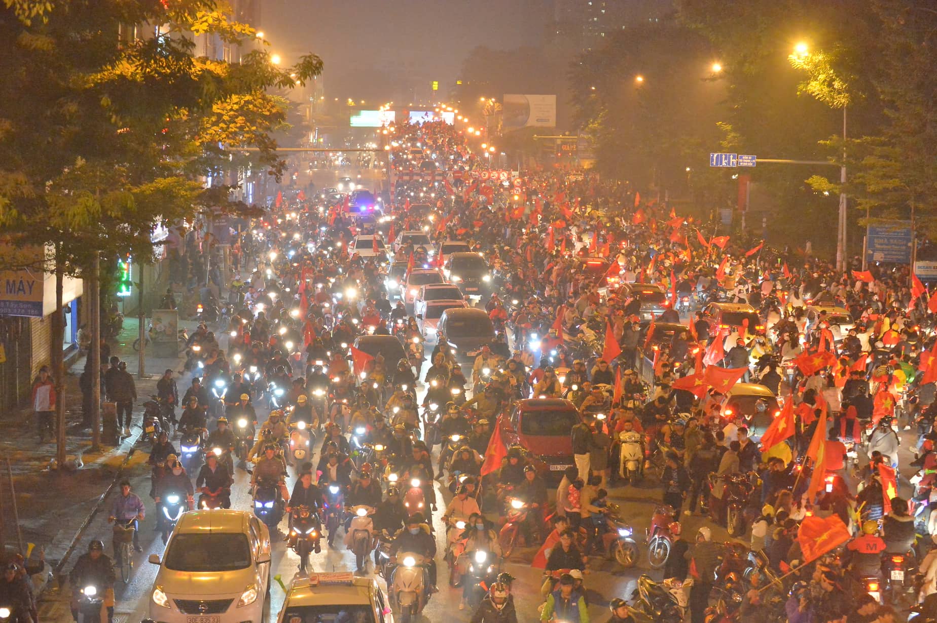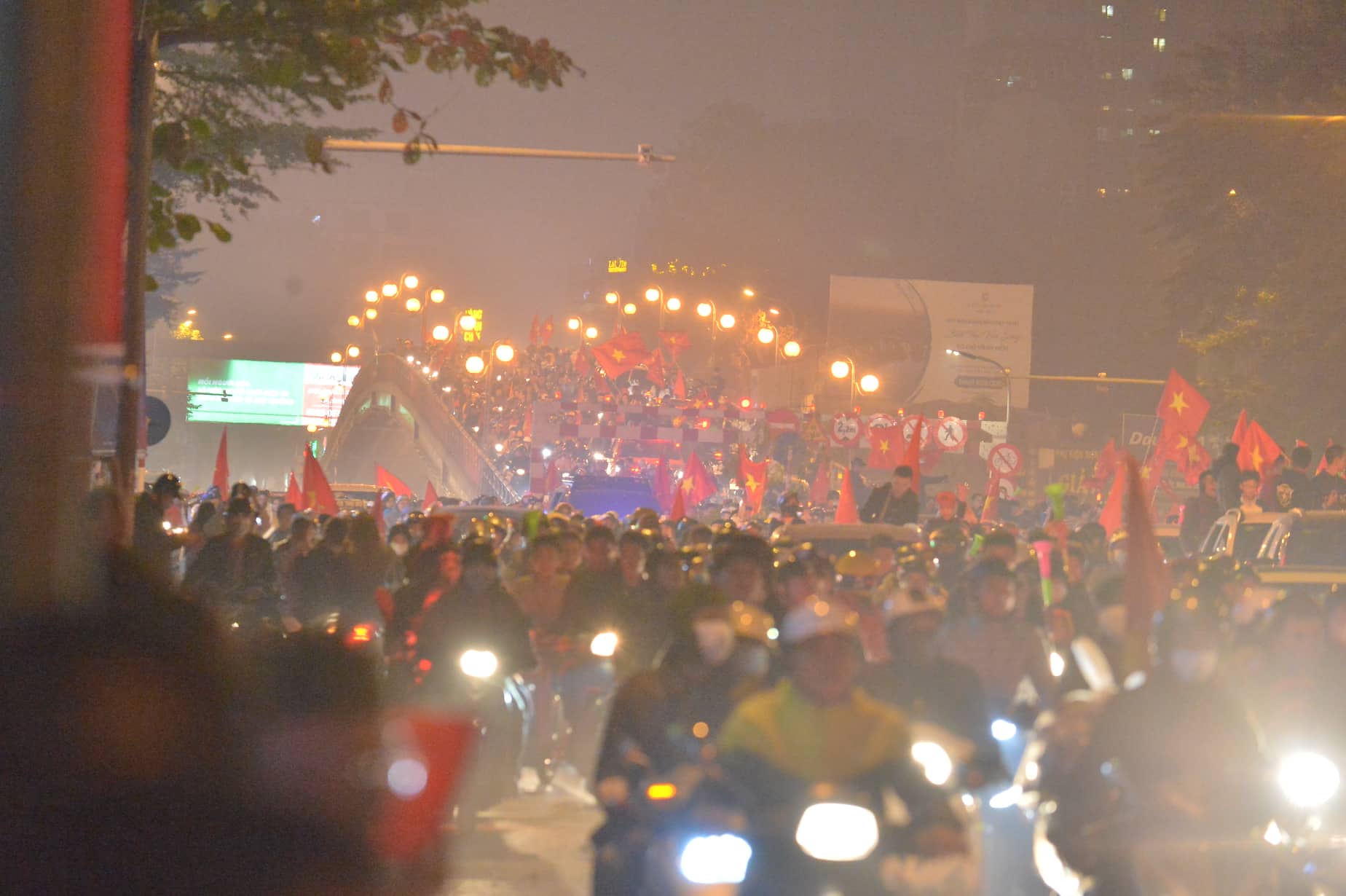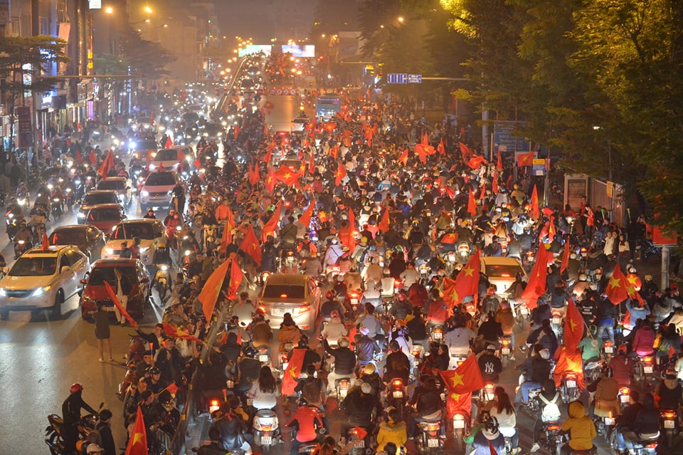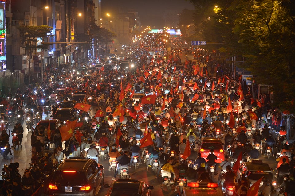 Sau chiến thắng lẫy lưng này, cổ động viên của đội tuyển Việt Nam đã đổ xuống đường đi “bão” ngay trong đêm. Những hình ảnh dòng người cùng cờ đỏ sao vàng, nối đuôi nhau hô vang đầy tự hào “Việt Nam vô địch”, trao cho nhau những nụ cười, những cái đập tay đầy tình cảm khiến khung cảnh đẹp đẽ hơn bao giờ hết. Những hình ảnh ấy một lần nữa lặp lại tại nút giao huyết mạch Tây Sơn - Chùa Bộc khiến nhiều người vô cùng xúc động.