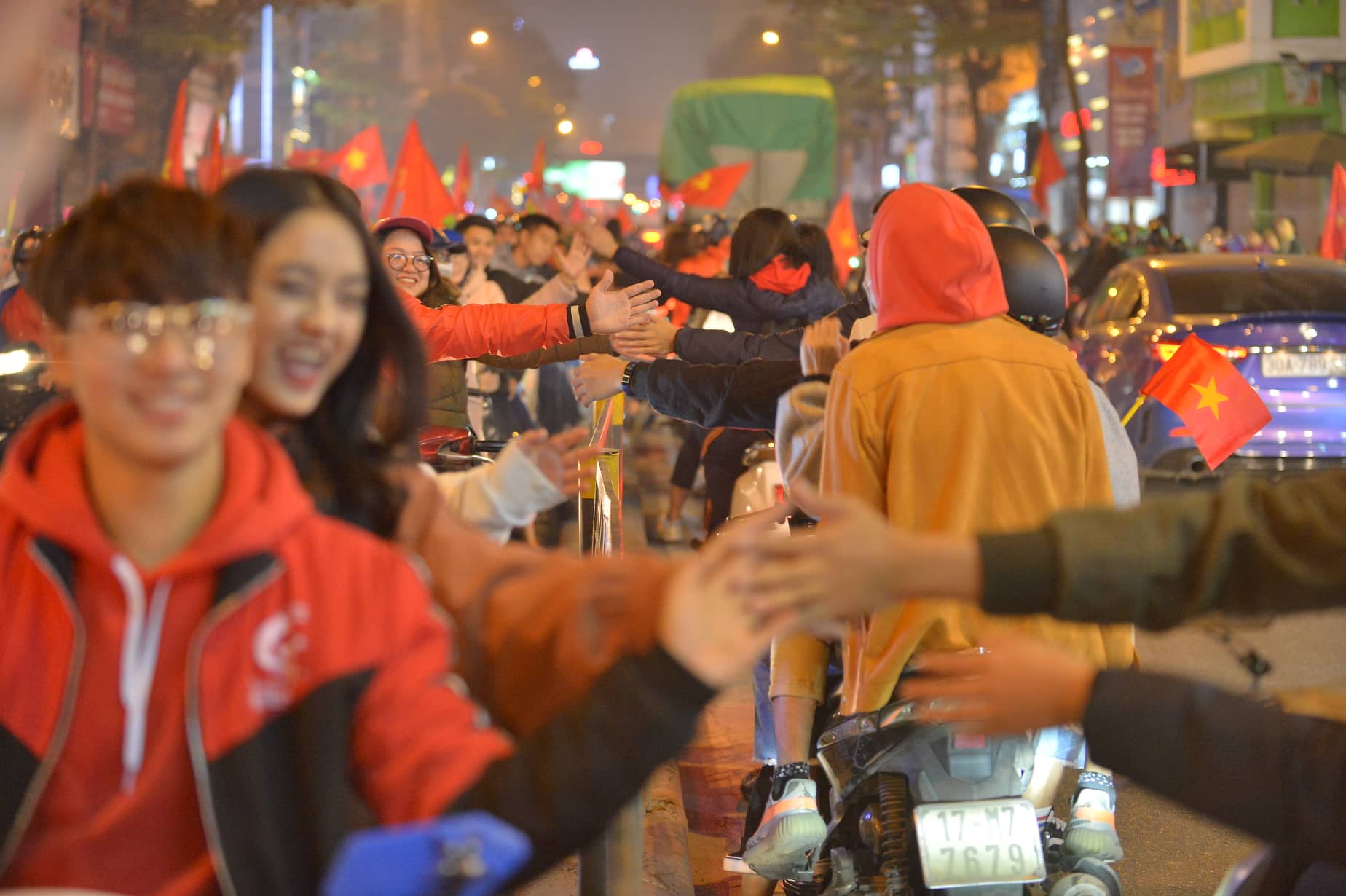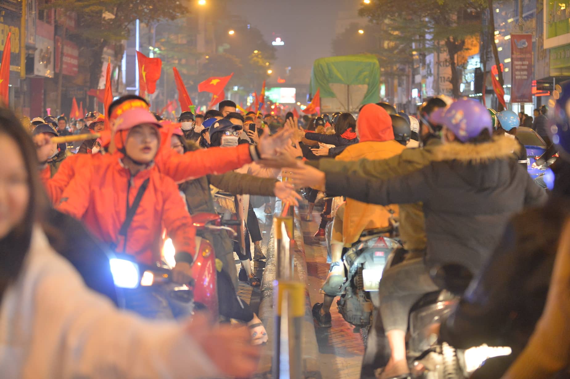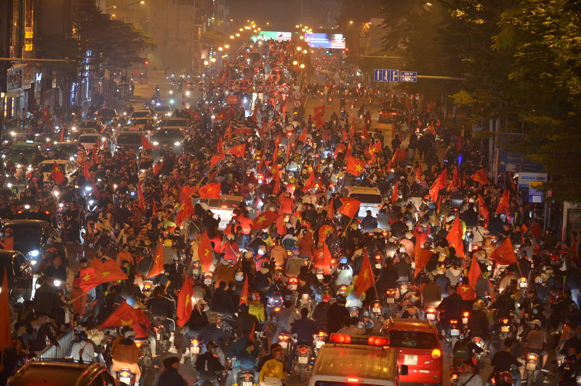 Sau chiến thắng lẫy lưng này, cổ động viên của đội tuyển Việt Nam đã đổ xuống đường đi “bão” ngay trong đêm. Những hình ảnh dòng người cùng cờ đỏ sao vàng, nối đuôi nhau hô vang đầy tự hào “Việt Nam vô địch”, trao cho nhau những nụ cười, những cái đập tay đầy tình cảm khiến khung cảnh đẹp đẽ hơn bao giờ hết. Những hình ảnh ấy một lần nữa lặp lại tại nút giao huyết mạch Tây Sơn - Chùa Bộc khiến nhiều người vô cùng xúc động.
