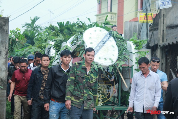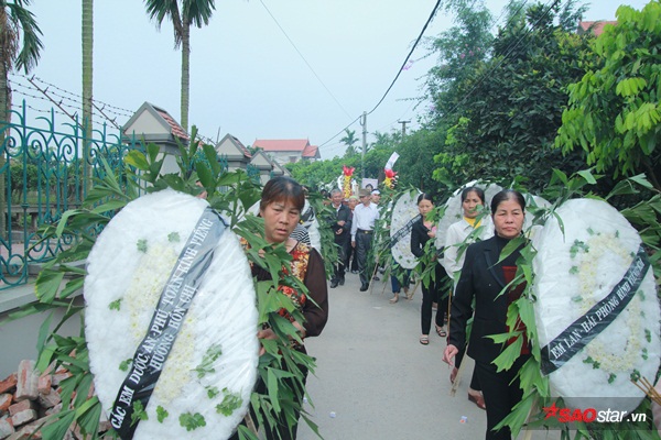 Những vòng hoa tang trắng phủ kín con đường làng nhỏ hẹp.
